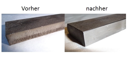 kauf Dir einen Keilzieher bei Bausch, kostet weniger als 10 €. Die Keilflächen sind sehr rauh, weil das Teil vermutlich durch Brennschneiden hergestellt wurde. Drücke die Keilflächen an einen Banschleifer. Der Keiltreiber muß dabei immer abgenommen und in Wasser getaucht werden, damit die Oberflächenhärte nicht verloren geht. Ziel ist, die beiden Keilflächen so glatt wie möglich zu bekommen (Oberflächenrauigkeit Ra0,8 oder besser, siehe Bild). Die Schleifriefen sollten dabei längs des Keils verlaufen, auf keinen Fall quer zum Keil.