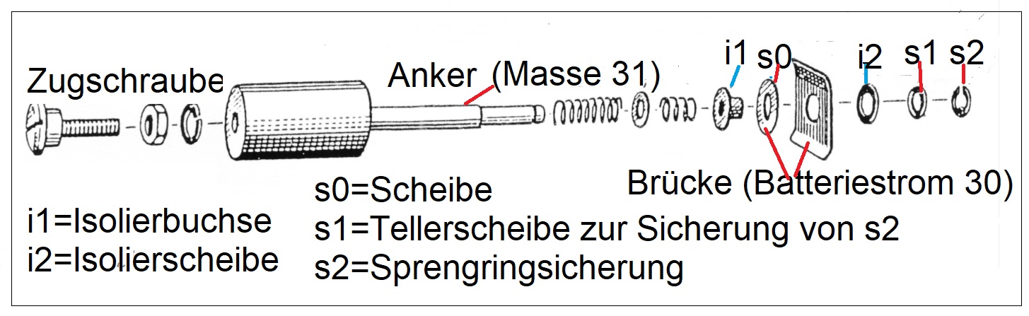 Sie ist am Ankerende mit einer Spiralfeder und einer Scheibensicherung federnd und zuverlässig befestigt und mit 1Buchse und 2 Scheiben aus Bakelit gegen den Anker isoliert.