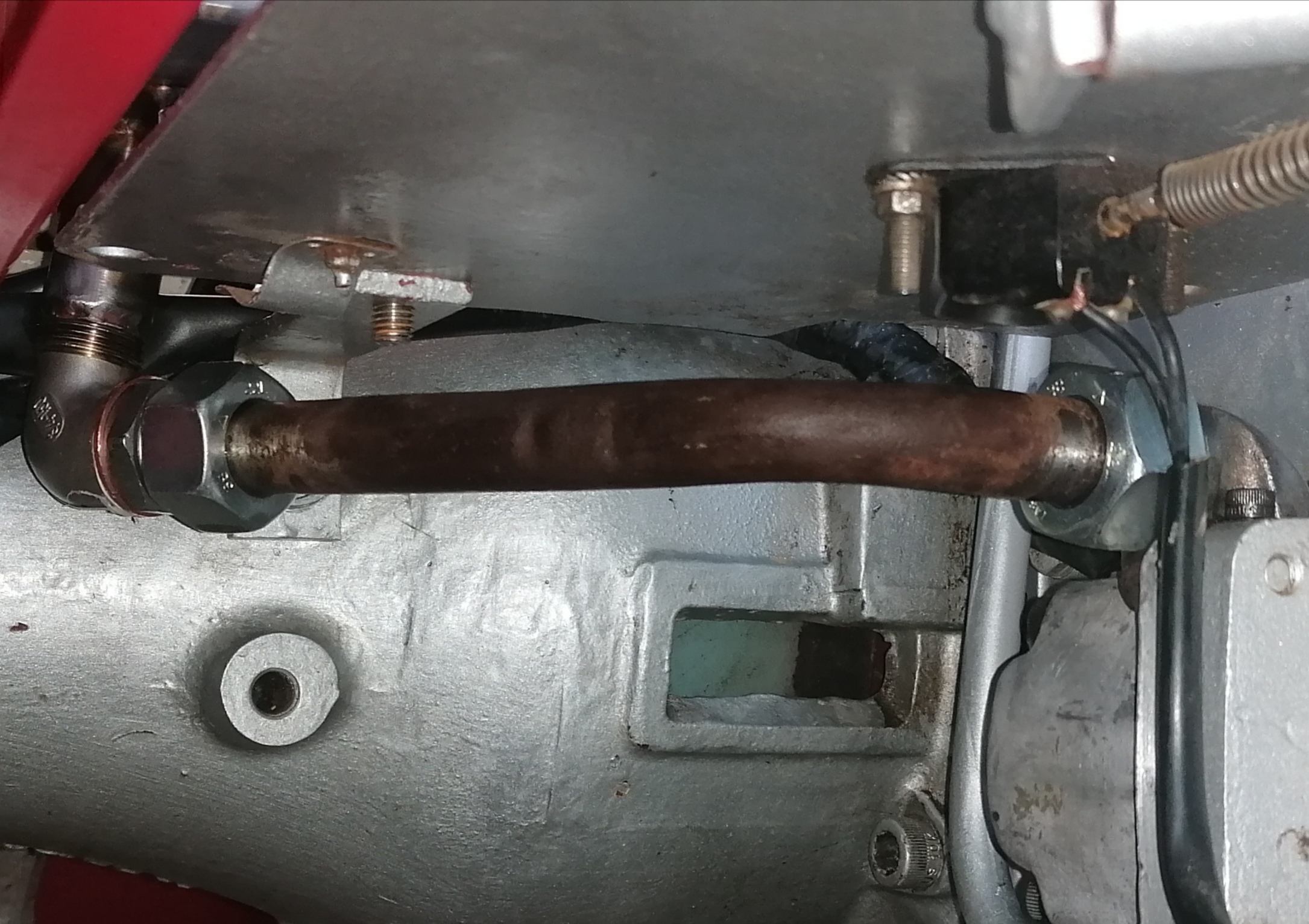Der Öltank sitzt unterhalb des Steuergerätes, ist in die Zulaufleitung der Pumpe integriert und mit einem Entlüfterrohr versehen. Das hatten wir bei einem ähnlichen Modell bereits einmal so gesehen. Die Position bei unserem Schlepper sieht man auf den angehängten Bildern.