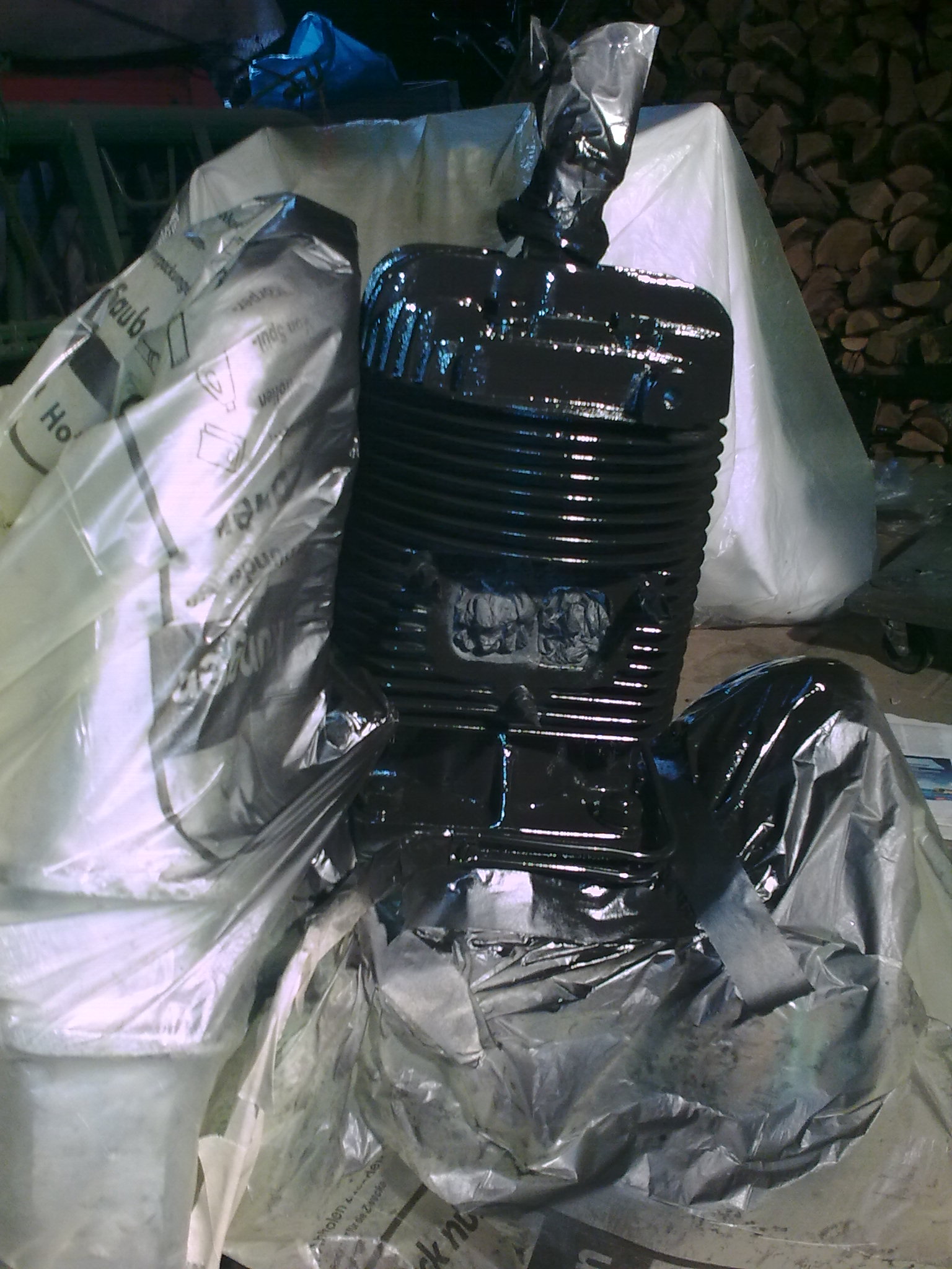 Vor dem lackieren des Zylinders mit Auspufflack wurde der Rest des Motors abgeklebt. Hier ist es sehr einfach indem man zwei gelbe Säcke nimmt und den einen über das Lüftergehäuse stülpt. Der Sack läßt sich zwischen Zylinder und Lüftergehäuse durchziehen und vorne über den Regler stülpen. Den zweiten Sack stülpt man hinten über die Kupplungsglocke, fädelt ihn hinter dem Ölanschluss des hinteren Hauptlagers ein und zieht ihn dann auf beiden Seiten nach vorne Richtung Lüftergehäuse. Der Rand rund um den Zylinderfuss wird einfach mittels Klebeband am Kurbelgehäuse abgeklebt und klebt dort auch gleich den hinteren gelben Sack mit an. Vorne verbindet man die beiden Säcke mittels Klebeband zusammen und erhält eine nahzu dichte Hülle. Liest sich vermutlich schwieriger als es ist. Ging sehr einfach.