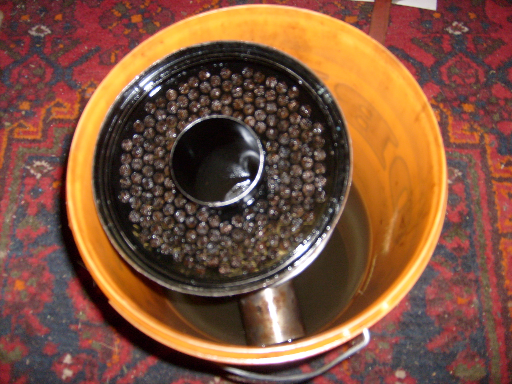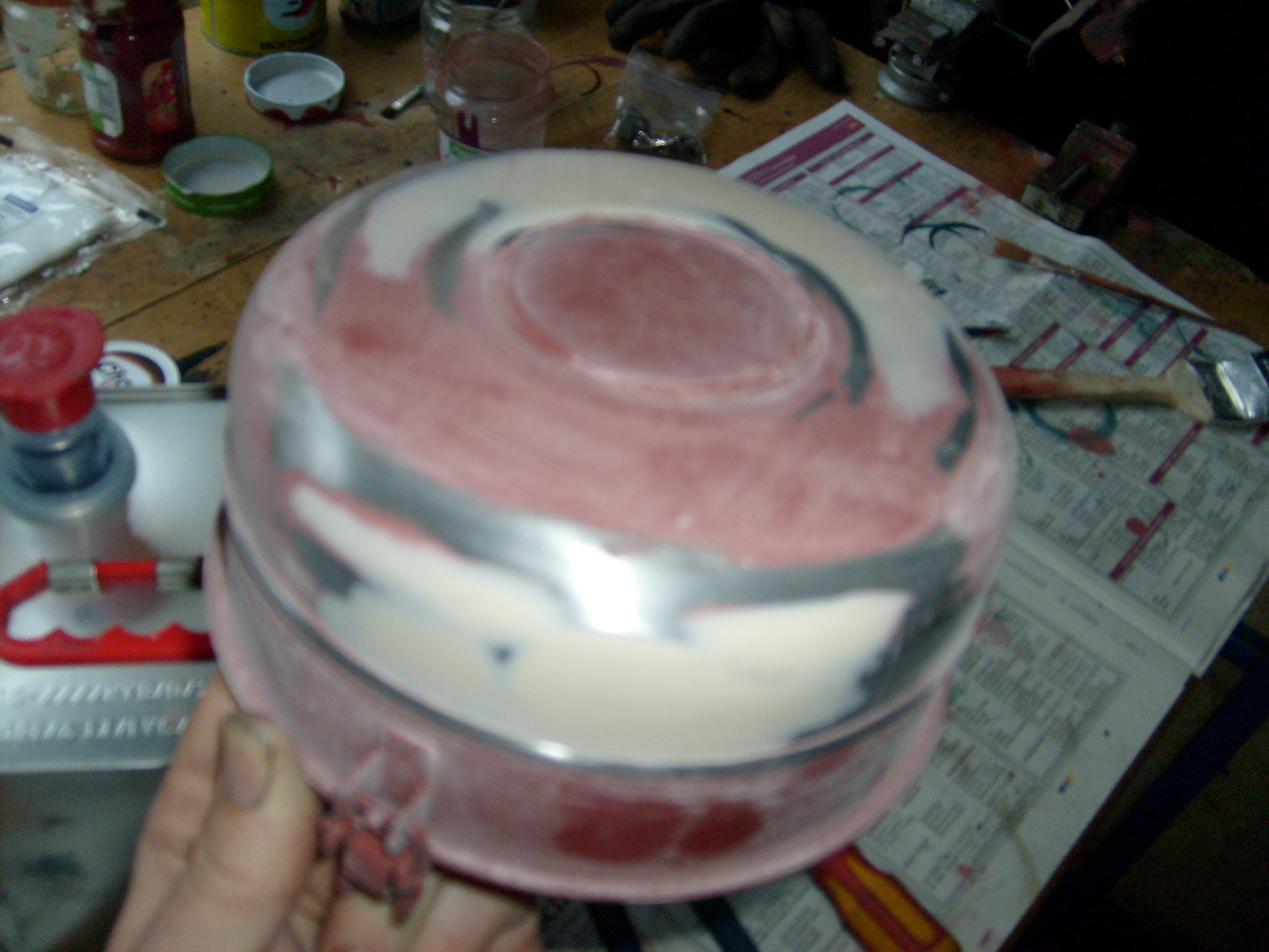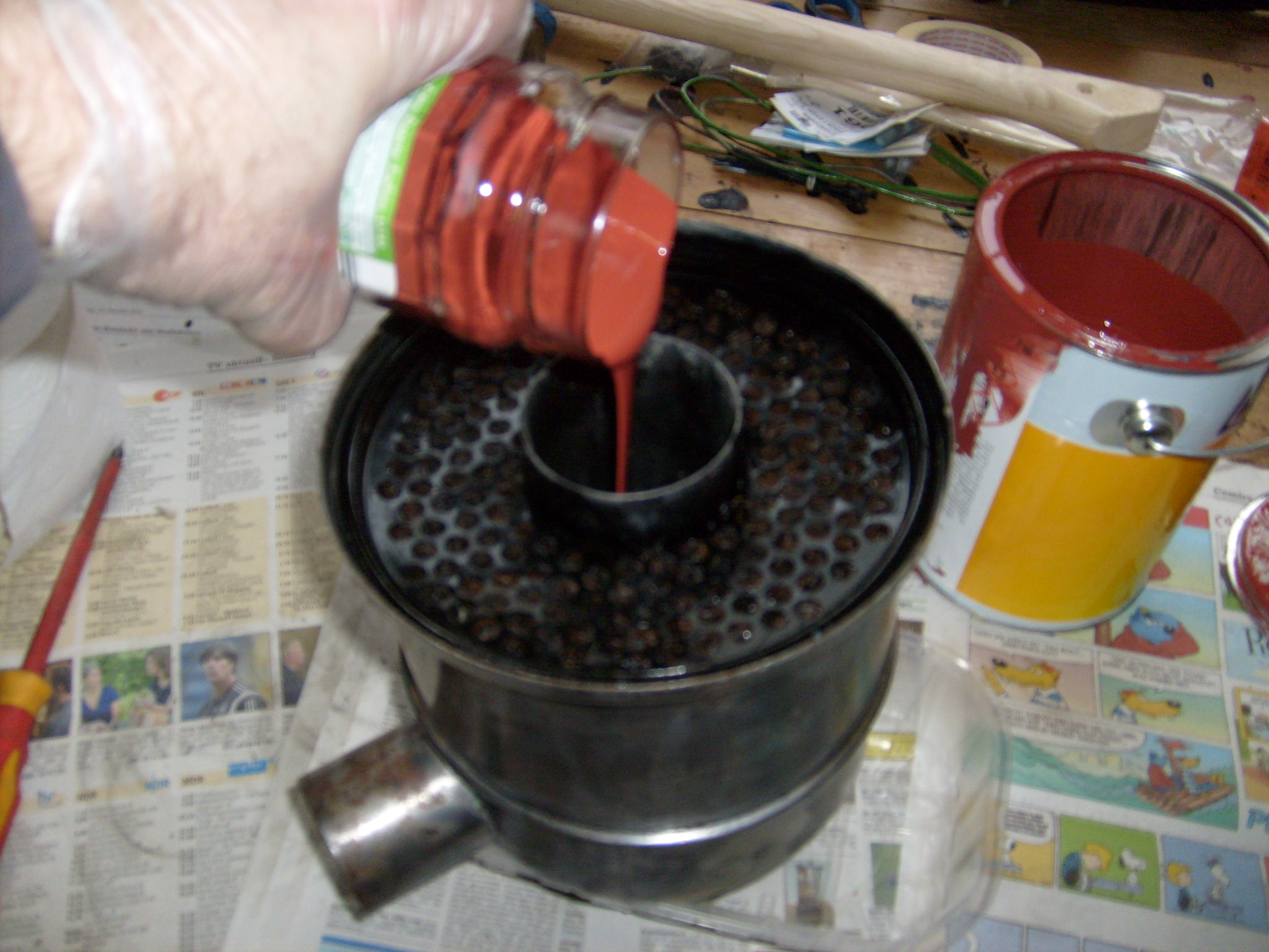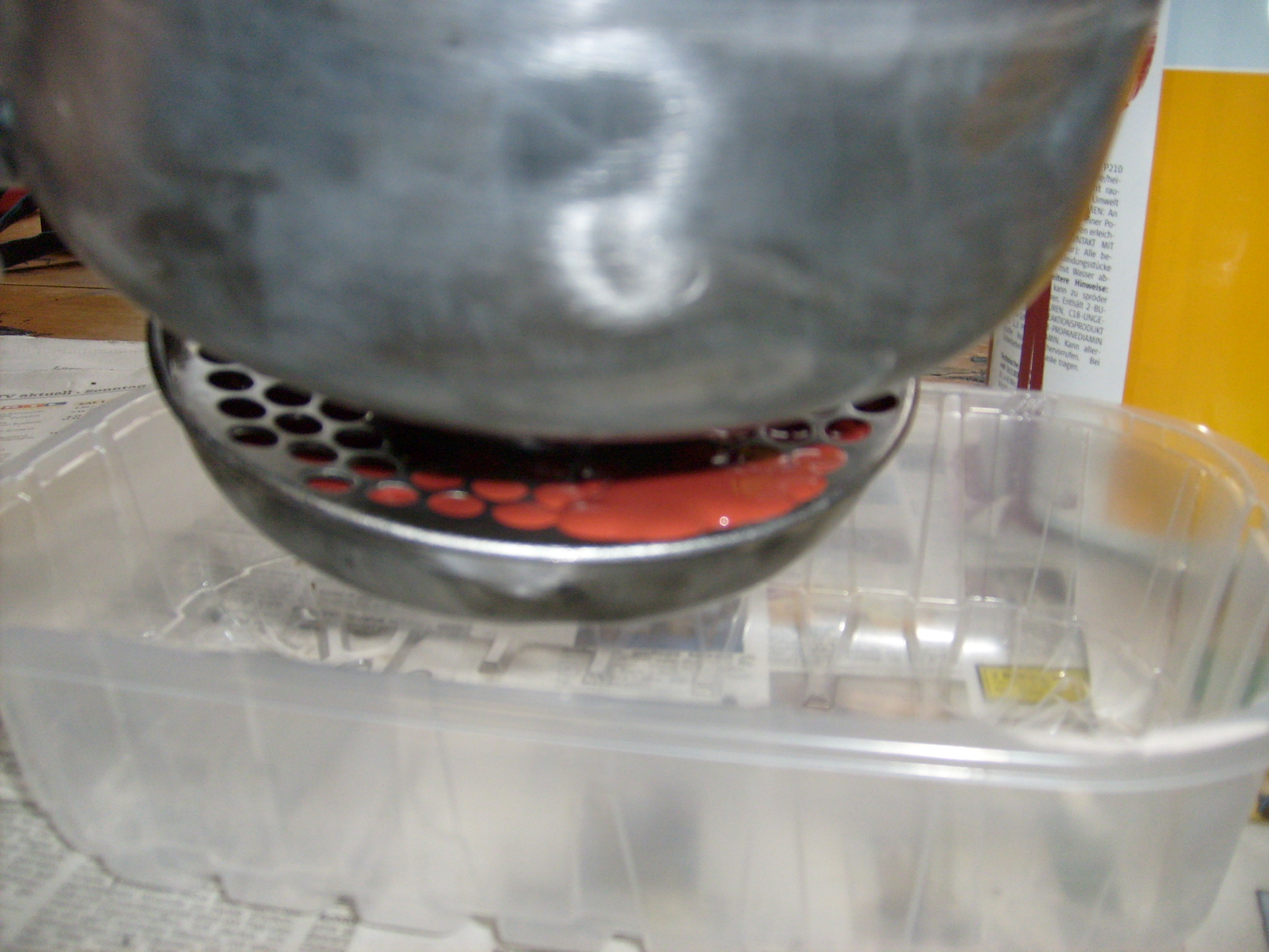 Danach das Ganze schön schwenken, so, dass die Grundierung nach außen durch die Löcher vom Pilz durchkommt. Damit ist der Pilz komplett von Innen geschützt. Überschüssige Grundierung durch umdrehen des Filtergehäuses nach unten abtropfen lassen. Diese abtropfende Grundierung kann man abwischen oder am besten gleich den oberen Bereich direkt unter dem Pilz mit dem Pinsel streichen. Das ist ein Bereich wo man nicht vernünftig mit der Lackierpistole reinkommt.