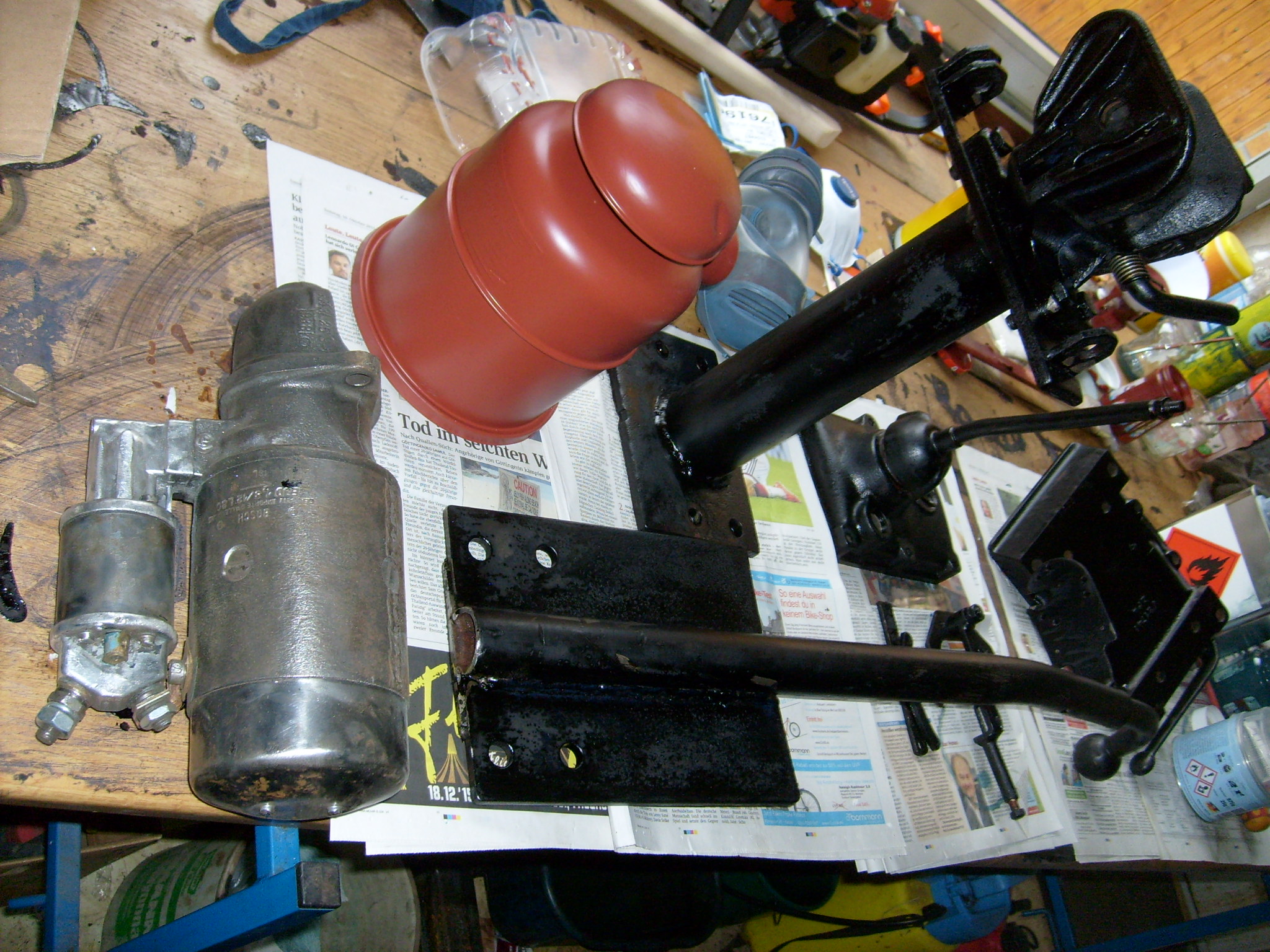 Die Sitzhalterung wird als nächstes zerlegt und die Innenseiten Sandgestrahlt. Die Bolzen sitzen jedoch fest. Erst mal mit Rostlöser einige Tage duschen. Andere Teile wie z.B. der Anlasser sind da problemlos. Einmal nackig gemacht und dann kann grundiert werden. Andere Teile sind noch problemloser, weil unbrauchbar für eine Entrostung, z.B. die drei Hydraulikzylinder. Für das Lenkrohr wird gerade ein Adapter angefertigt, der ein neues Lenkrad aufnehmen kann. Der Vorteil ist, dass die alte Struktur der Lenkradaufnahe dabei komplett erhalten bleibt und auch das alte Lenkrad. Das neue Lenkrad hätte man größer aufbohren müssen und eine neue Nut einstechen, aber da wäre rundherum zu wenig Material stehengeblieben, die Bruchgefahr bei 6km/h wäre einfach viel zu groß :wink:.