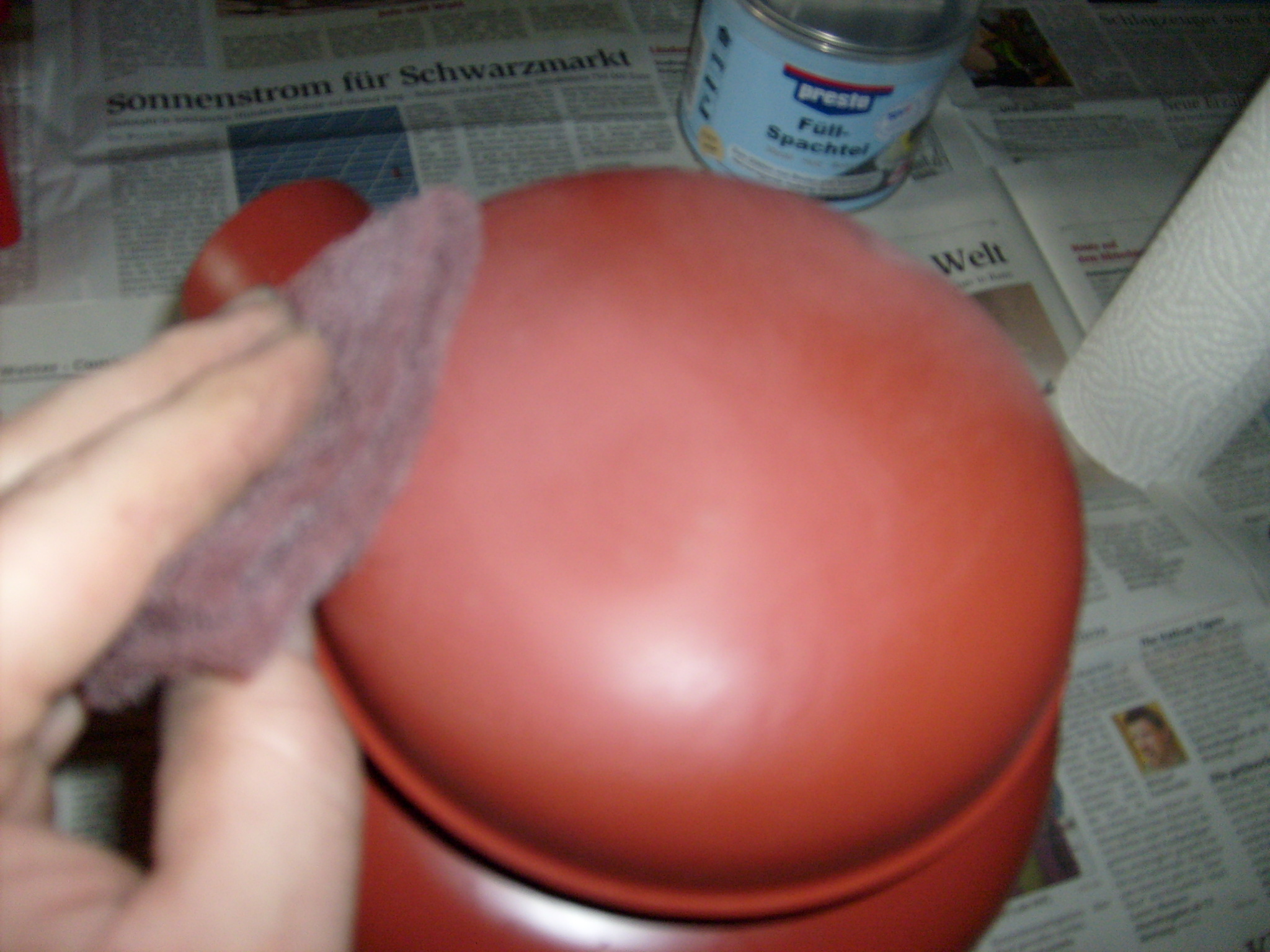 Profis mischen den Spachteln auf/mit einem zweiten Spachteln an und streichen beim vermischen von Spachtelmasse mit dem Härter beide Komponenten von dem einen Spachtel auf den anderen. Es ist also kein verrühren sondern eher ein vertreichen. Nach dem Prinzip wie man Kugellager einfettet, indem man einen Klecks Fett auf die Hand gibt und dann das Lager in das Fett eintaucht und nach unten auf der Handoberfläche abstreift. Nun, wir mischen Spachtel auf einem Frühstücksbrettchen an nach der Bond Methode: "Gerührt, nicht geschüttelt...!" ...oder so ähnlich... :D Ist aber immer noch einfacher und sicherer als auf einer Pappe. Die löst sich irgendwann auf und man hat die Papierfetzen im Spachtel. Nach dem möglichst dünnen auftragen der Spachtelmasse sofort das Arbeitswerkzeug mit Pinsel und Verdünnung reinigen. So hat man für den nächsten Spachtelauftrag immer schön saubere Utensilien. Der erste Schleifvorgang erfolgt mit 80 er Papier. Der Endschliff vor der Grundierung mit 240 er bis 320 er. An Rundungen immer von Hand und vor allem Trocken!