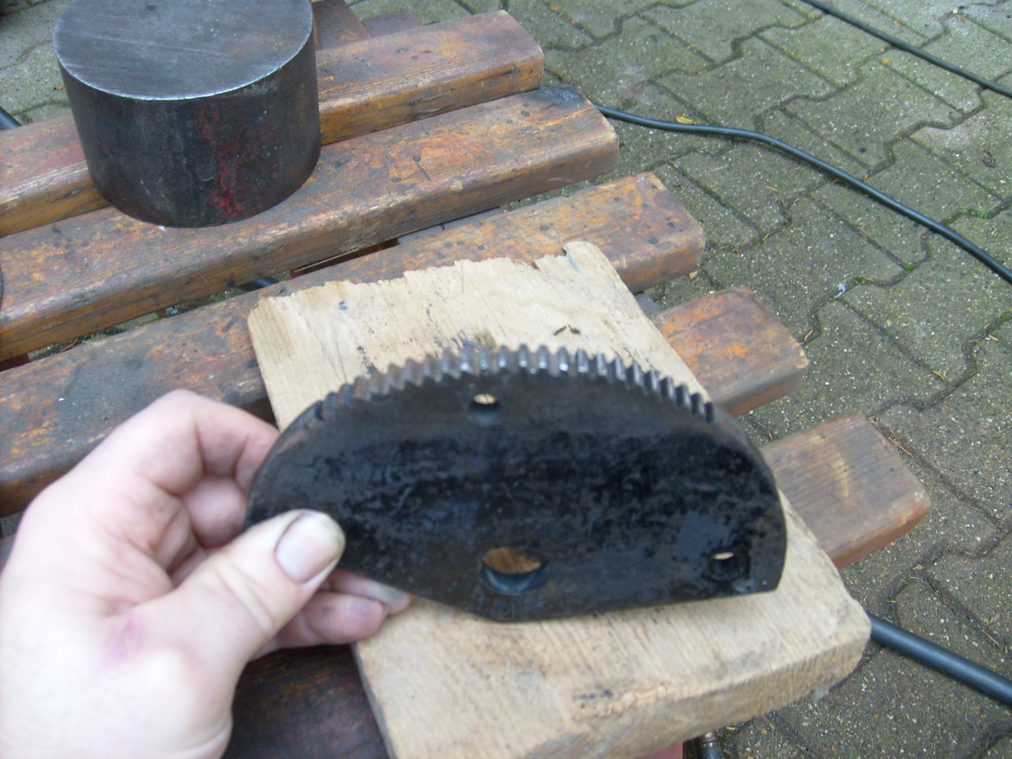 Jetzt war unser persönlicher Angstgegner an der Reihe. Der verbeulte Kraftstofftank mitsamt Werkzeugkiste, die gleichzeitig als Tankhalterung fungiert. Problem? Die Kiste ist aus 1,5 bis 2 mm Stahlblech gefertigt und war nicht nur verbeult sondern auch windschief, also in sich verdreht per Kaltverformung. Die halbkreisförmige Aussparung für den Kraftstoffbehälter war auf der eine Seite nach unten abgeknickt. Bei einem "normalen" Blech kann man sowas recht leicht wieder rund biegen, aber hier dient als Verstärkung und als Führung für die beiden Tankbänder jeweils eine um 90 Grad abgewinkelte Kante.