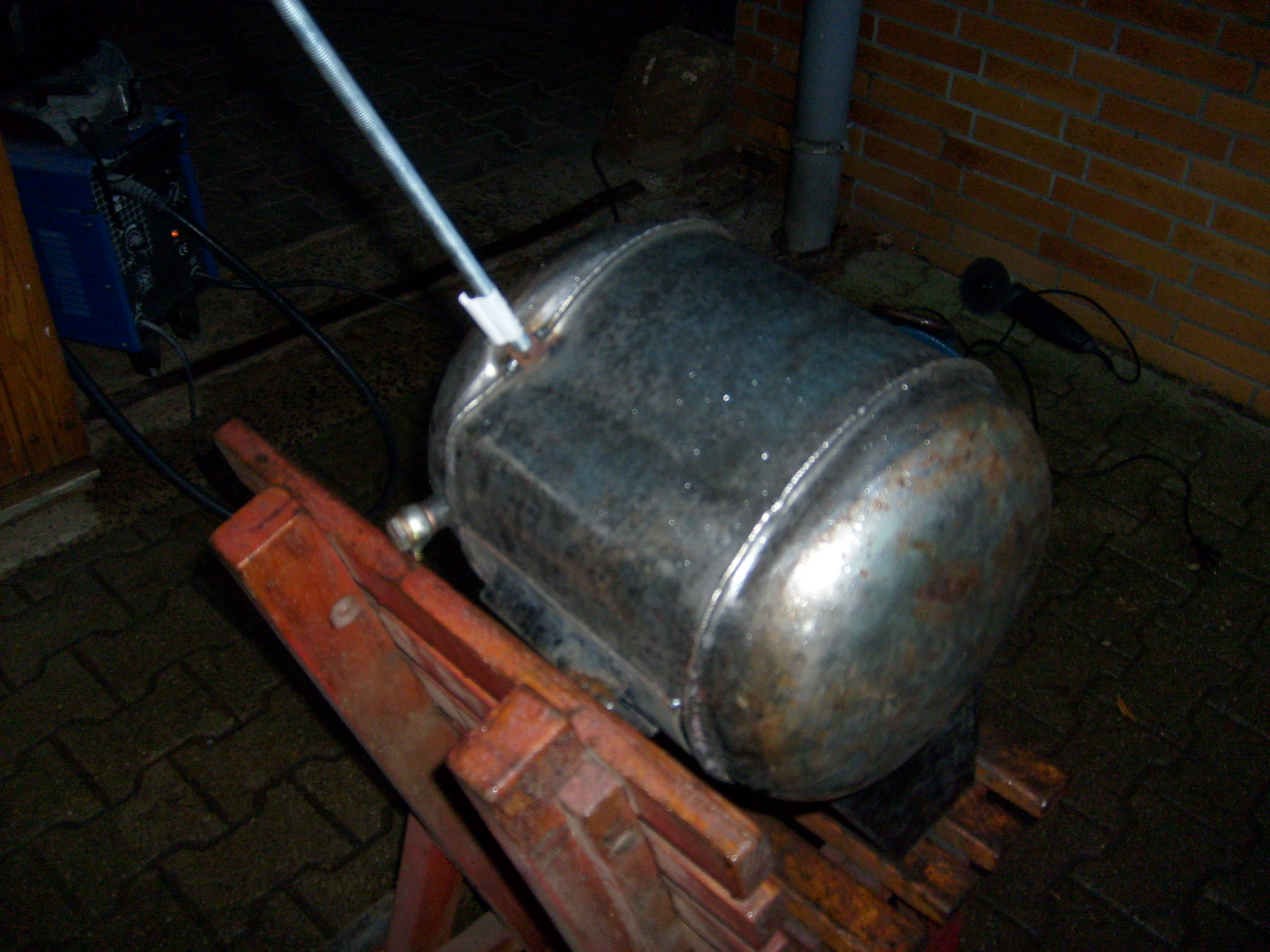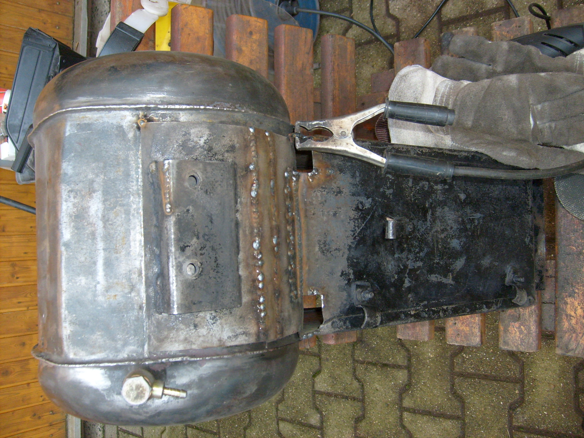 Zurück zum Tank. Der Knick war leider genau da, wo die Schweißnaht den mittleren Teil mit dem Seitenteil verbindet. Also an einer recht stabilen Stelle. Wie beult man sowas aus? Klar, in einer Karosseriewerkstatt gibt es super Schweißgeräte mit denen man Unterlegescheiben oder ähnliches anpunktet und mit einem Schlaghammer das eingedrückte Blech herausziehen kann. Im Internet ist auch viel die rede von "Wasser in den Tank und in die Gefriertruhe!". Prinzip: Gesprengter Motorblock. Eine andere tolle Idee ist zum Beispiel die mit den Erbsen oder Linsen. "Tank damit randvoll füllen und heißes Wasser drauf!" Diese Methoden haben sich scheinbar so gut bewährt, dass es davon noch nicht mal ein youtube Video gibt. Ironiemodus aus. Ne, dass ist mir alles zu Haarsträubend. Wir haben dann eine M 10 Mutter genommen und an die tiefste Stelle der eingedrückten Stelle geschweißt. Eine M 10 Gewindestange wurde eingeschraubt und eine 10 kg Hantelscheibe plus diversen Zubehör diente als Schlaggewicht. Im Nachhinein war das etwas übermotiviert. Hätte man ncht gedacht, dass da soviel Bums hinter sitzt. Irgendwas zwischen Trägheit und Masse hat nicht ganz hingehauen. Dachte ja echt das da zuerst die zwei Punkte zwischen Mutter und Tank abreißen. Nö, es hat den ganzen Tank oben abgerissen! :shock: Also beim nächsten Mal entweder mit 5 kg Hantelscheibe oder einfach etwas weniger Schmackes beim "hanteltieren" mit der 10 Kilo Scheibe!Vielleicht war auch der Anlauf und damit die Endgeschwindigeit der 10 kg Masse etwas zu hoch auf der 1 Meter Gewindestange. Na ja, Delle ist jedenfalls raus....jetzt Beule.... :kloppe: Wenn man nicht alles selber macht....In meiner ganzen Aufregung habe ich davon kein Bild gemacht. Besser für meine Nerven. Hier mal der wieder zusammengesweißte Tank, der natürlich noch hartgelötet wird. Mit Schutzgas Tank dichtschweißen ist schwierig. Jetzt sieht das Ganze wenigstens wieder gleichmässig verbeult aus. Auf der anderen Seite wurde das auch so gemacht und nur ganz vorsichtig mit der 10 kg Scheibe gezogen. Geht!