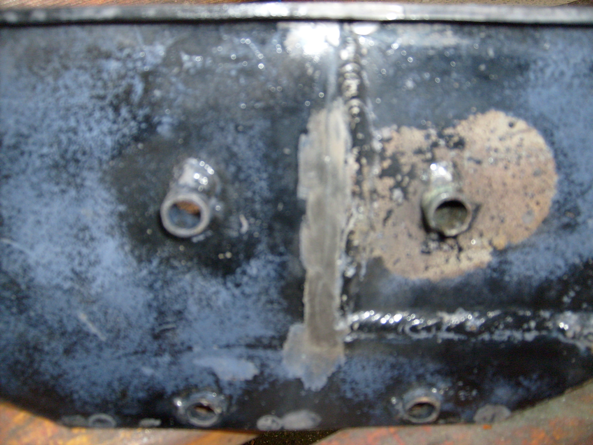 Vergleichsweise einfach war die Reparatur der Luftfilter-und Öltankhalterung. Hier wurde wieder klar, warum in gewissen Bereichen der Kraftfahrzeuge keinesfall durchgehende Schweißnähte gesetzt werden dürfen und Punkten oberstes Gebot ist. Im Bereich einer durchgehenden Schweißnaht verspödet das Material. Vereinfacht gesagt. In der Berufsschule hat man uns etwas erzählt von Kistallgefüge, Kohlenstoff und Co. dass sich das bei Hitzeeinwirkung dauerhaft verändert und man daher auch keinesfalls z.B. Lenkungsteile wie Spurstangen- und Köpfe über 600 Grad malträtieren sollte. Wie sagte der Meister zum Lehrling, der eine verrostete Spurstange mit dem Schweißbrenner zum Ausbau überredete? "Wenn Du Sie ausgebaut hast kannste gleich in die Tonne werfen!" Im Falle einer Schweißung spricht dann davon, dass ein Bruch dann genau neben der Schweißnaht entsteht. Rahmenteile am Auto z.B., nur Punkten, niemals durchgehend schweißen. Soviel zur Theorie. Die Halterung vom 13 er ist jedenfalls mal mit einem Elektrodenschweißgerät brutal zusammengeschweißt worden, rundherum,durchgängig und genau da entstanden dann die Risse. Die Risse haben wir dann trotz besserem Wissen auch wieder durchgängig geshweißt. Warum? Erstmal die Optik. Ein lackiertes Teil mit einem sichtbaren Riss? Unschön. Zum Zweiten ist das ja nun kein sicherheitsrelevantes Bauteil. Drittens, dass Fahrzeug hat die meiste Zeit gelaufen. Beim hinstellen und angucken wird so schnell nichts wieder einreissen. :) Im Bild die Unterseite der Halterung. Die sichtbare Naht ist die originale Naht, daneben das blanke ist die Stelle wo geschweißt werden soll mit dem Riss drin.