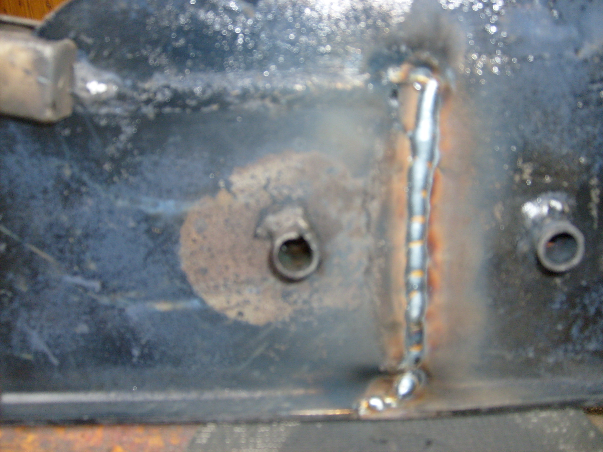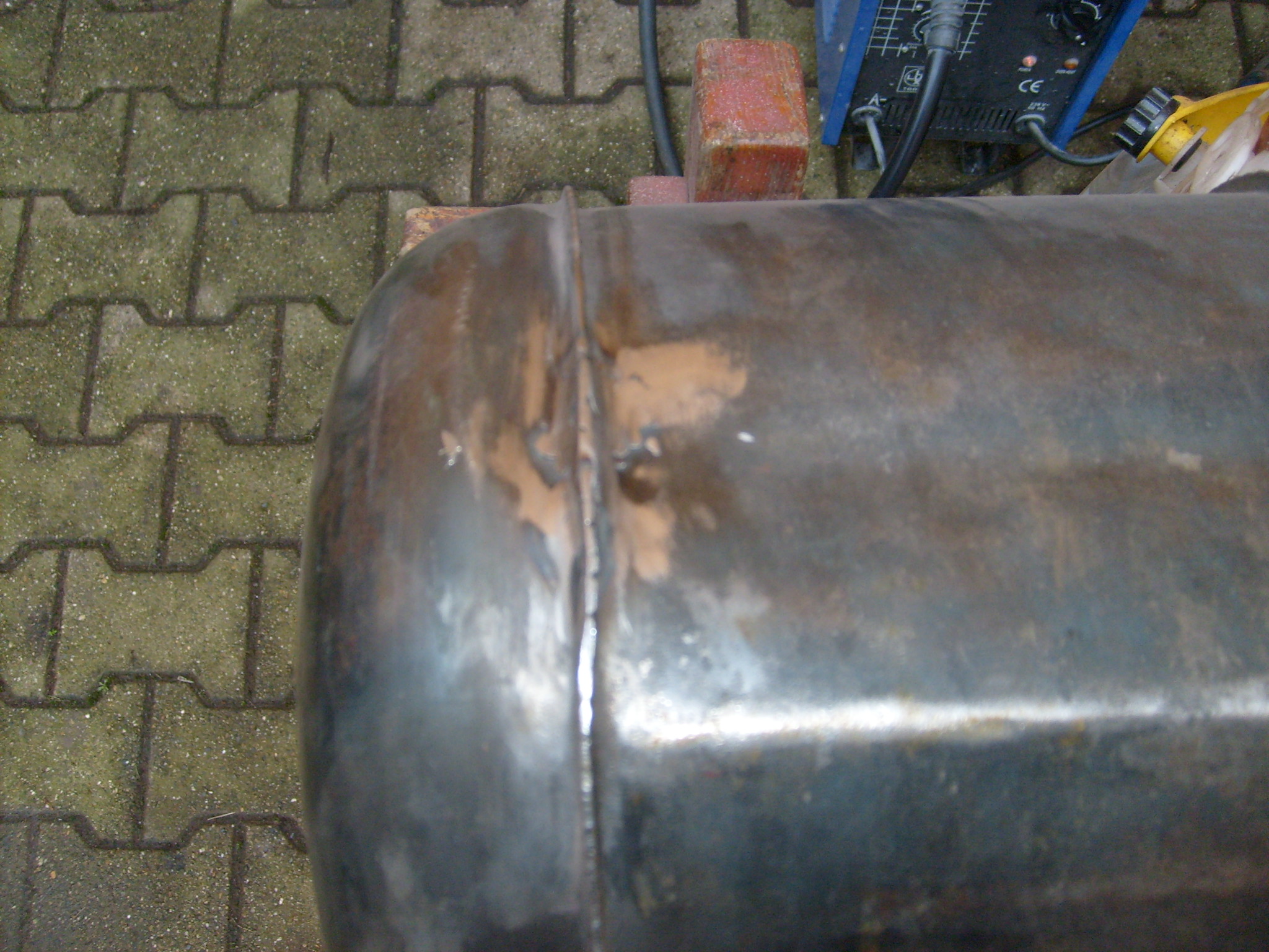 Also wurden zwei Schnitte in die Tankhalterung gemacht, die Halterung gebogen und dem Tank angepaßt und danach Punkt für Punkt zugeschweißt, damit sich das Blech durch die Hitze nicht wieder in die alte Form verzieht. Sicherheitshalber trotzdem das Blech mit einem Punkt am Tank angepunktet. Auf dem Bild sieht man schon die fast fertig gerichtete und geschweißte Kiste mit den noch fehlenden Verstärkungen, die gestern angefertig und eingeschweißt wurden. Ist aber noch nicht ganz fertig. Bilder folgen.