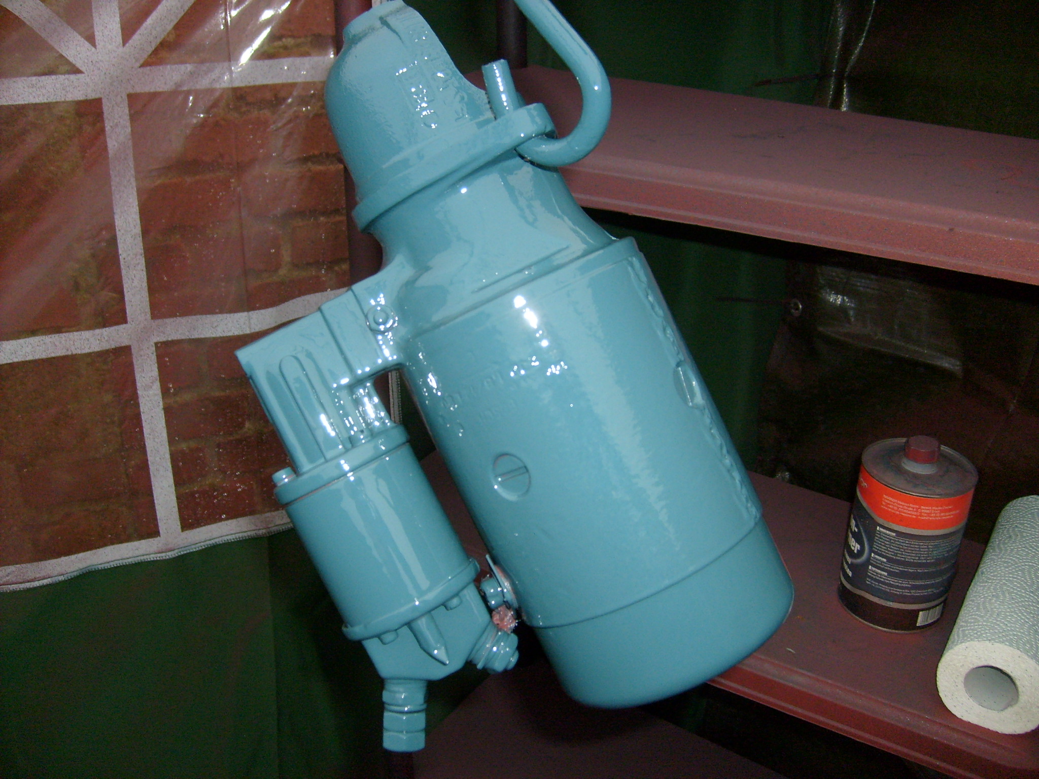 Schwierig zu lackieren: Ölsammeltopf des Luftfilter. Die Halteklammern glänzen mit winzigen Ecken wo der Farbnebel nur schwer reinkommt. Außen herum hingegen sammelt sich der Lack beim lackieren der Innenseiten der Halteklammern derart an, dass es droht herunterzulaufen. Von der Konsistenz her dicker eingestellter Lack nützt hier leider nichts, denn den bekommt man erst recht nicht in die kleinen Ecken rein. Der Lack wird also eher dünner eingestellt aber dafür die Farbmenge die vorn aus der Lackierpistole kommt entsprechend verringert. Das geht indem man den Abzug nicht voll durchzieht. Vorsicht beim husten... :wink: Dabei sammelt sich an der Luftdüse aber Lack an, weil mehr Lack als Luft nachfließt, vereinfacht gesagt. Das kann man schön beobachten, wenn man so mal eine Minute lackiert. Irgendwann fliegt dann die anhaftende Lackbrocke mit der Luft auf das zu lackierende Teil.Wenn es nicht gerade eine Effektlackierung werden soll eher unvorteilhaft. :lol: Hier hilft nur regelmässiges abwischen der Lackierdüse mit einem in Verdünnung oder Silikonentferner getränkten Tuch. Oder man reduziert den Zulauf der Lackmenge an dem entsprechenden Einstellrädchen der Lackierpistole. Das ist auch empfehlenswert bei kleinen Teilen wie z.B. runden Stangen wie z.B. dem Gasgestänge oder so. Man ballert nicht den guten Lack unnütz in der Weltgeschichte herum.