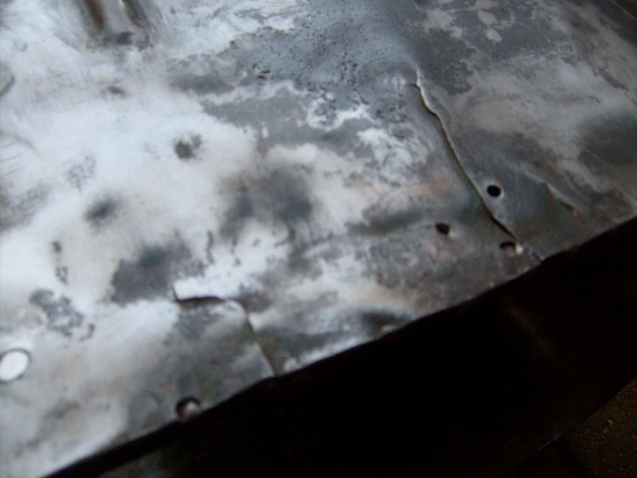 Als erstes wurde der Bereich der Motorhaubenhalterung von einer Öl-Fett-Erdkruste befreit. Erst mit Teppichmesser und Staubsauger, abschließend mit Verdünnung und Pinsel. Das Öl das vom Motorregler in die Haube tropfte hat den Bereich der Motorhaube vor dem sicheren Durchrosten bewahrt. Bei unserem D2416 z.B. war hier die Haube komplett duchgefault. Draußen auf dem Hof wurden dann erst einmal alle Risse gesucht und zugeschweißt. Hier mal einige Risse.