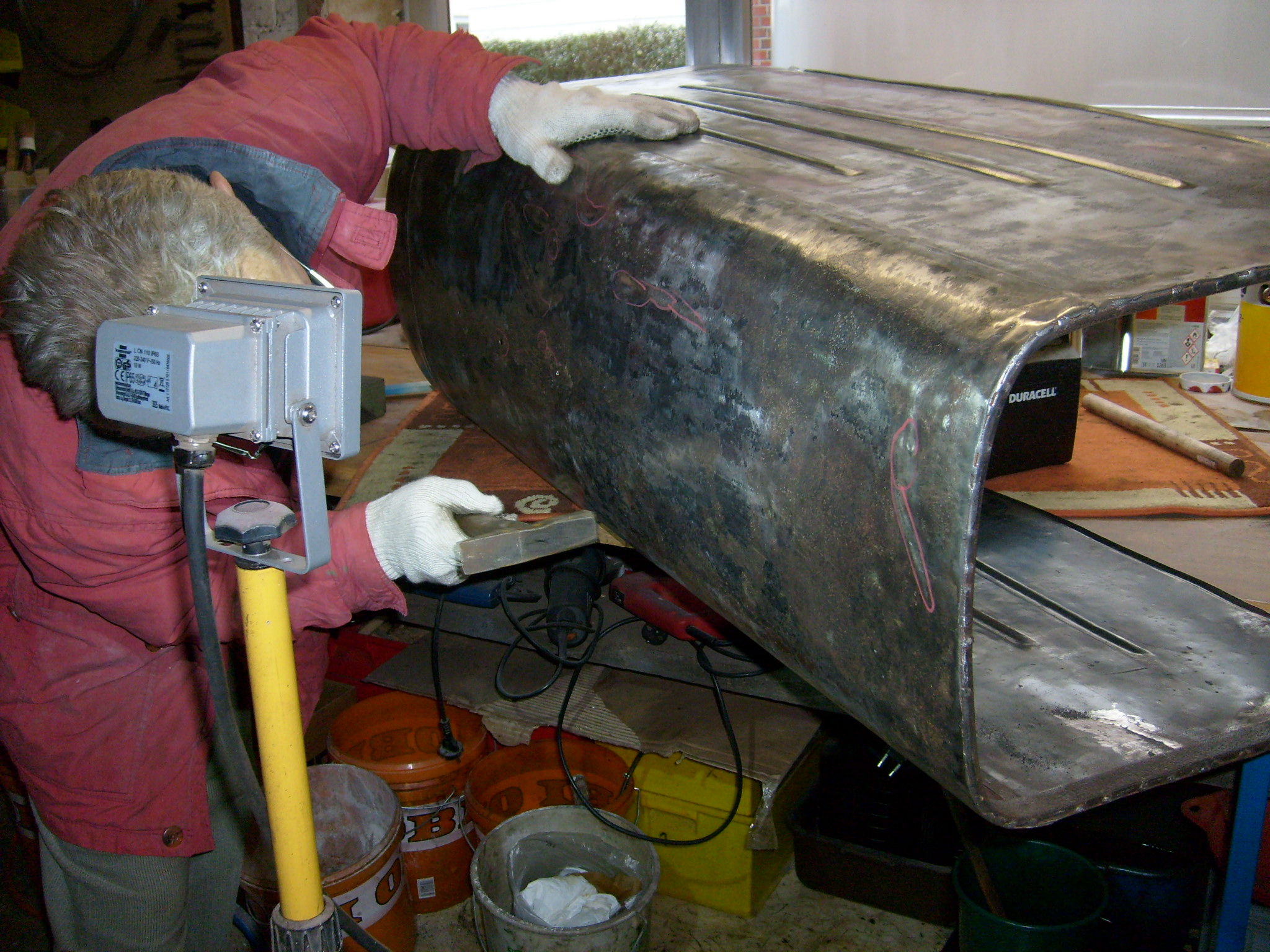 Das leicht eingerissene Drahtgeflecht vorne in der Motorhaube wurde geschweißt und dann gefeilt bis es wieder schön war.