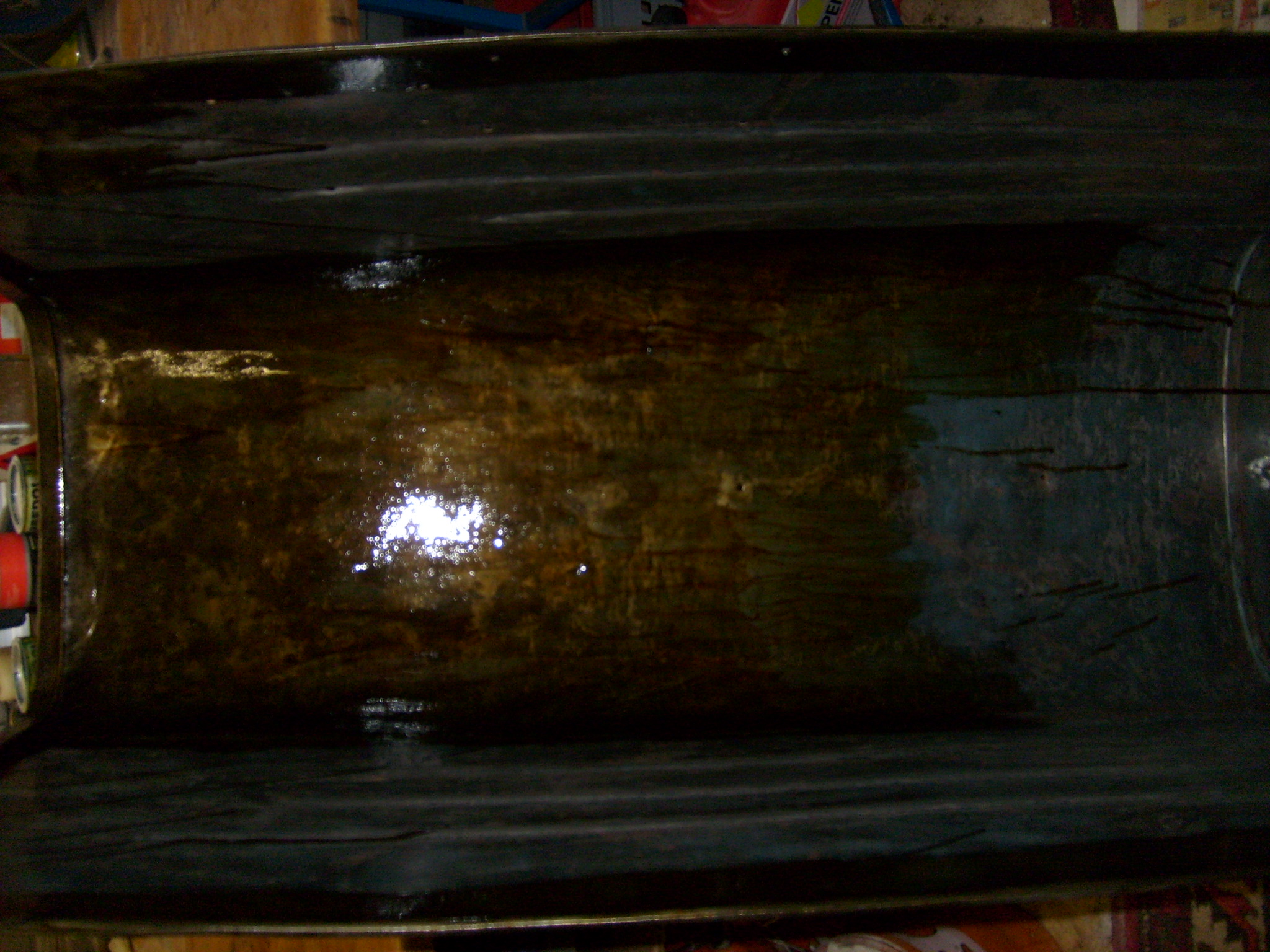 Der vordere Teil der Motorhaube steht dabei unten auf dem Boden. Durch schwenken der Haube läuft dann alles überschüssige Fertan, dass sich im untersten Bereich gesammelt hat, zurück in den durch das Gitter verdeckten Blechbereich. So wurde dann erst die Innenseite der Motorhaube komplett von oben nach unten gepinselt. Bilder von der schwarzen Motorhaube folgen.