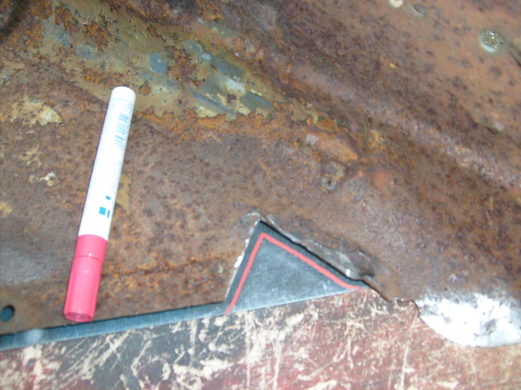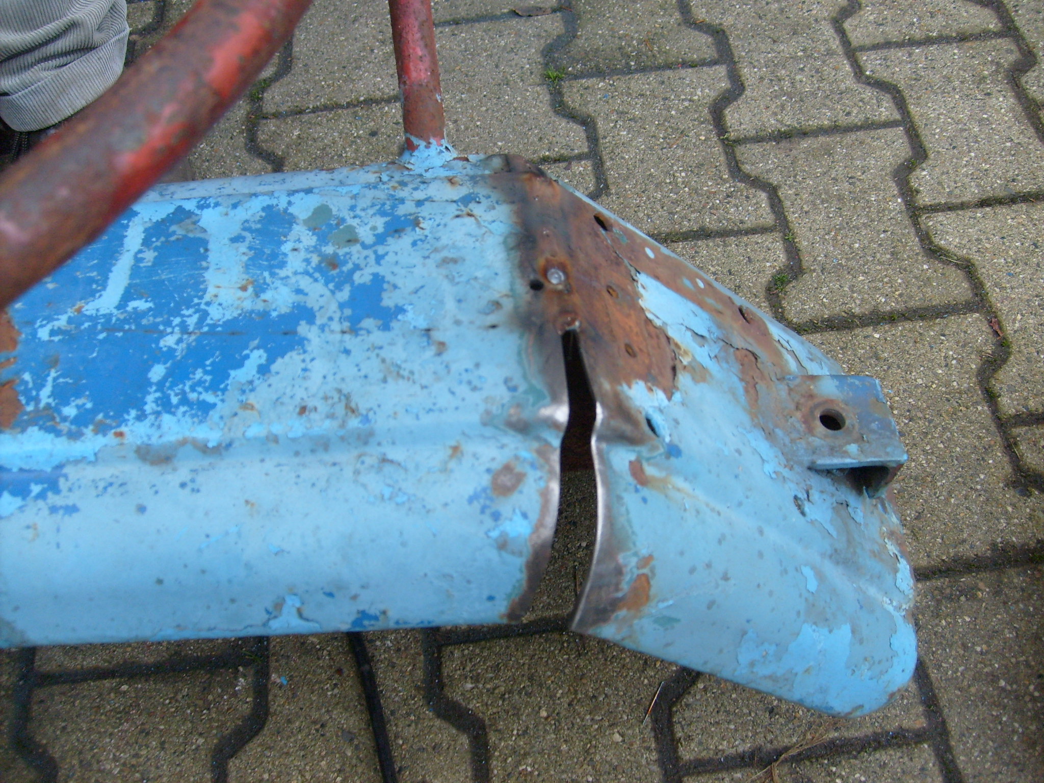 Das fehlende Stück Blech wurde durch ein Stück verzinktes Blech ersetzt das gerade zur Hand war. Schablone schneiden? Warum? Der Kotflügel diente als Schablone. Blech drunter schieben, anzeichnen, Dreieck ausschneiden, einschweißen, schleifen, fertig. Bilder vom fertigen Zustand beider Kotflügel vor dem Sandstrahlen folgen.