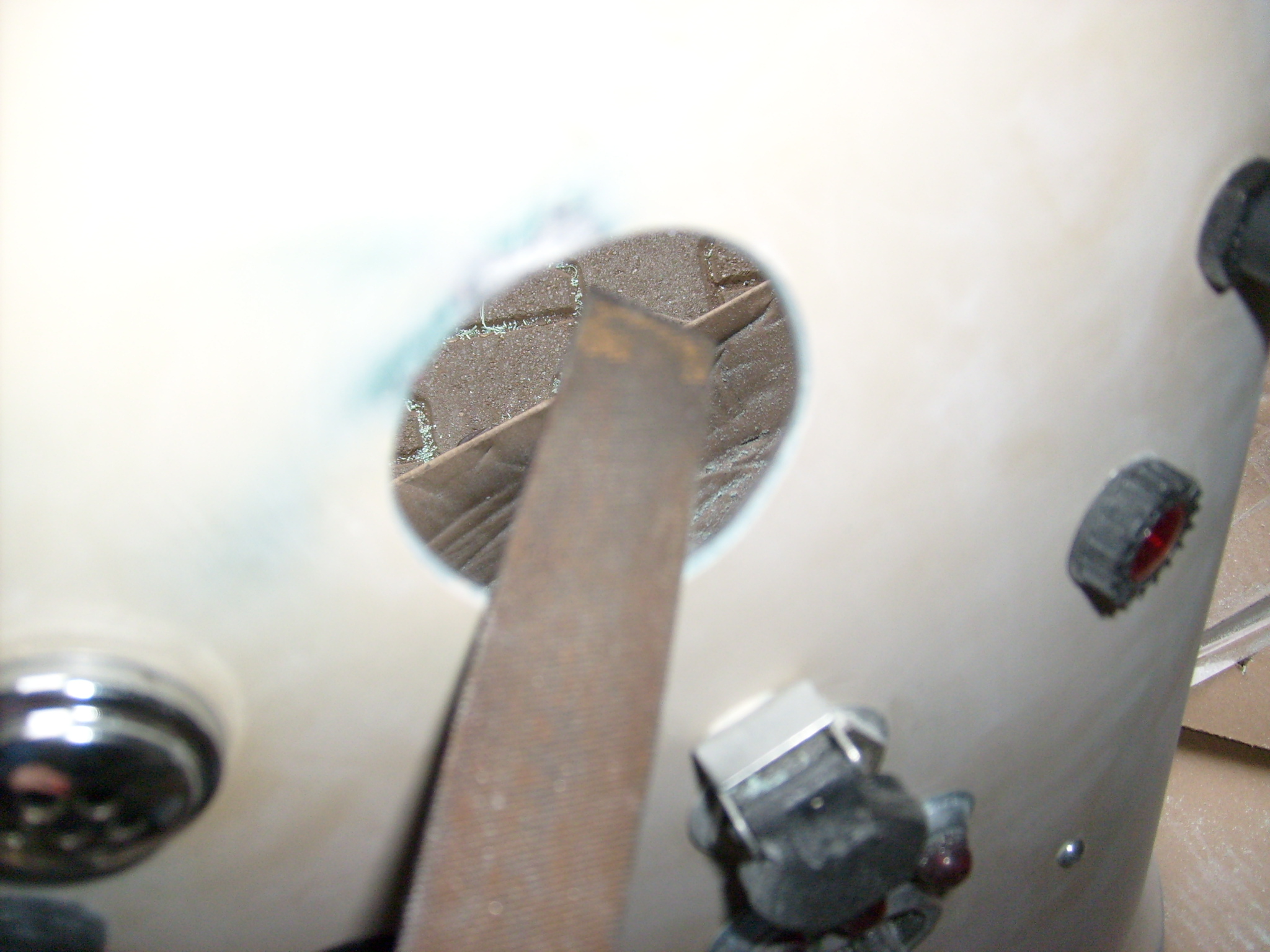 Es galt 4 Instrumente mit einem Gewindedurchmesser von rund 25mm einzubauen. Auf der Rückseite wurde klar, ja, diese sind auch vorhanden. Schön. Nur, wo kommt was hin? Beim Kauf des Schleppers war schon alles ausgebaut. Also selber kreativ werden, wie das Ganze denn am sinnvollsten zu handhaben ist. Nach einer Stunde probieren war die Belegung eigentlich klar...Betonung liegt auf eigentlich. Nachdem mit der Flex und einer Fächerscheibe auf der Rückseite überstehender Spachtel, der aus den Bohrungen gequollen war, abgeschliffen wurde, konnte das erste 25mm Loch von hinten mittig mit einer Handbohrmaschine und einem 6 mm Bohrer aufgebohrt werden. Na? Ist denn der Bohrer stumpf? Nimmt ja gar kein Ende... :shock: Jetzt weis ich auch wo die 1,5 kg Glasfaserspachtel geblieben sind, frei nach dem Motto "Darf´s ein bißchen mehr sein?" :D Und da kommt wieder das Wort eigentlich in´s Spiel. Das Gewinde des Blinkerschalters z.B. ist schlichtweg zu kurz, damit man noch die Mutter vorne drauf bekommt... Warum machen die das Gewinde so kurz? 10mm länger, würde ich gerne 1 Euro mehr für ausgeben, aber nein. Warum einfach wenn´s auch schwierig geht? Wir hatten im Teileregal noch einen alten Blinkerschalter der genau über so ein längeres Gewinde verfügt. So einer muss dann eben neu nachbestellt werden. Kein Drama. Also wurden erst mal alle 25 mm Löcher aufgebohrt, was dann übrigens von vorne mit einem Stufenbohrer prima funktionierte. Die 1- stündige Planung war jedenfalls für die Katz, denn im Endeffekt wurde die Belegung ganz anders. Theorie und Praxis... Glücklicherweise paßten die anderen drei Instrumente gerade so eben. Die Gewindelängen gaben die Einbaulage vor.