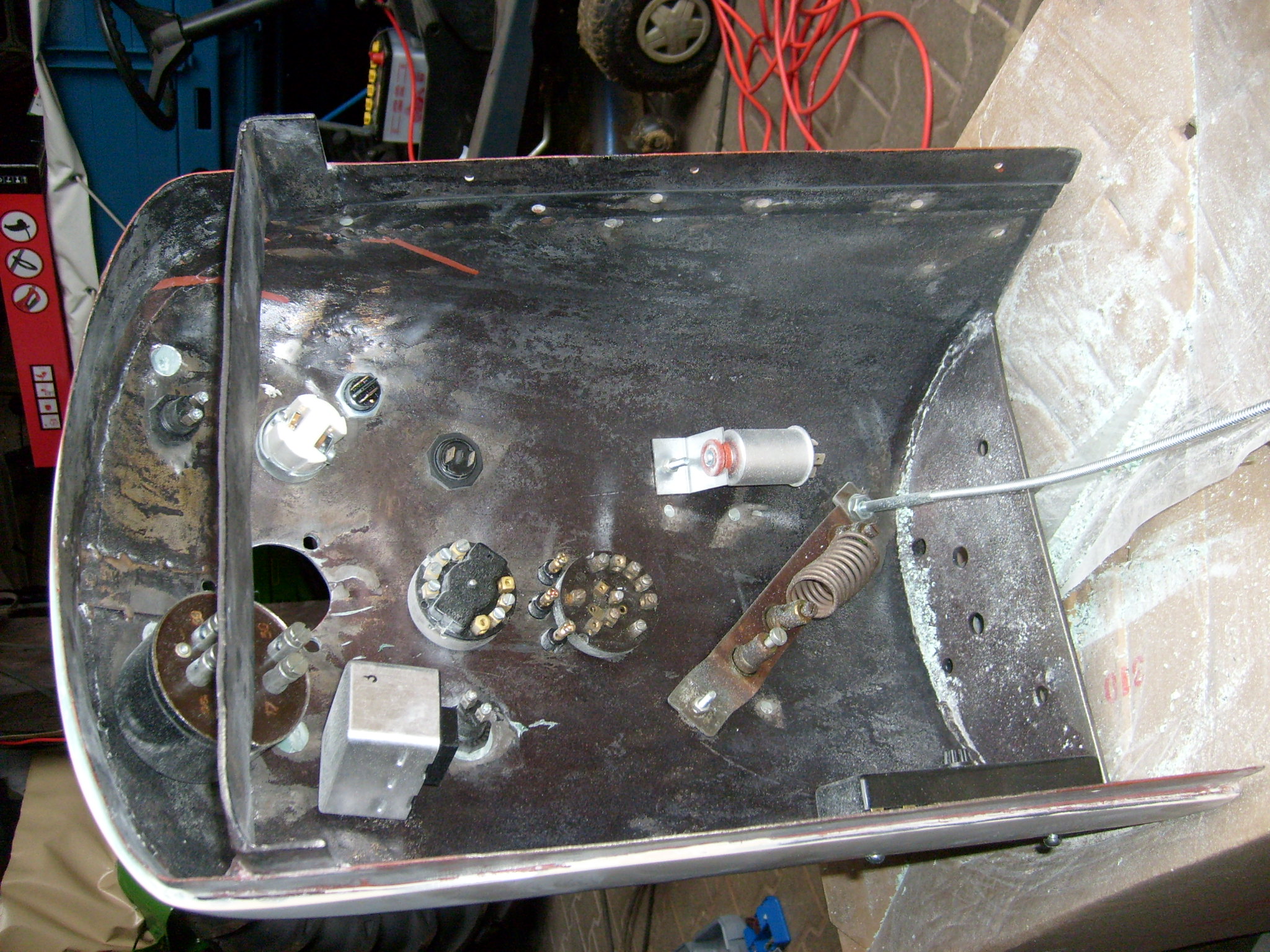 Vor dem grundieren mußten in dem Armaturenträger natürlich zunächst einmal wieder die Löcher zur Aufnahme der Instrumente freigelegt werden. Erst mal alles hingelegt was eingebaut werden muss, zur Orientierung. Schnell war klar das einige Löcher zugespachtelt bleiben können. Da hatte in der Vergangenheit jeder der Lust hatte irgendetwas eingebaut, anstatt die vorhandenen Bohrungen sinnvoll zu nutzen. ... :?