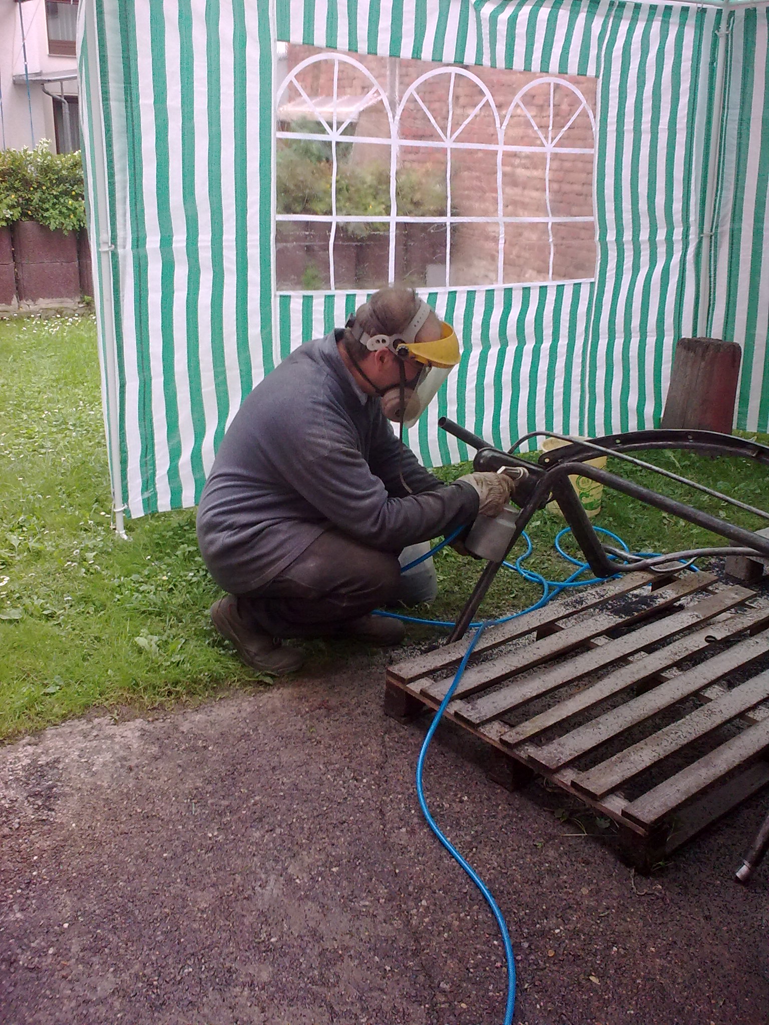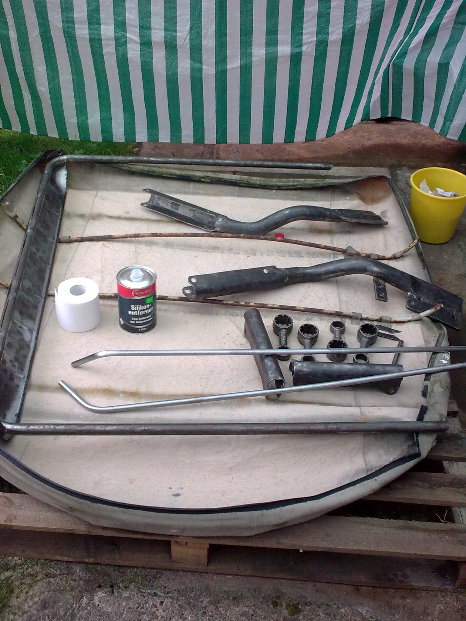 Nach dem Trocknen der Teile haben mein Vater ich zuerst die neuen Gummidämpfer in die Federarme eingebaut. Mit reichlich Silikonspray, etwas Hilfswerkzeug und einem Schraubstock ging es ganz gut. Bei den kleinen Gummibuchsen ist es ratsam diese nicht ganz in die Federarme einzudrücken, weil die Stahlbuchse, die dann noch hineingeschoben werden muss, arg klemmt und die Montage erschwert. Besser ist es die Gummibuchse erst nur etwa ein Drittel einzudrücken, dann die Stahlbuchse einzuschieben und beides zusammen im Schraubstock oder in einer Presse in die Endlage einzudrücken. Die mit Silikon eingeschmierten Federarme wurden anschließend mit Silikonentferner gewaschen, damit bei der weiteren Montage am Verdeck nicht das Silikon an anderen Teilen weiter übertragen wird und eine spätere Lackierung gefährdet.