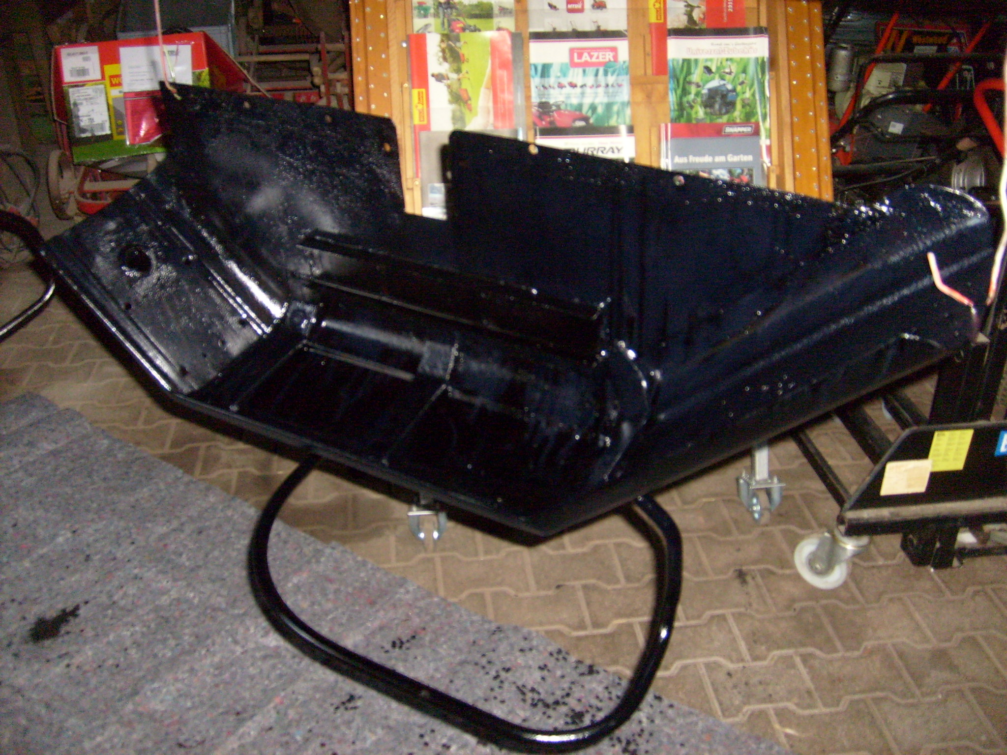 Nachdem die Oberseite gepinselt war wurden die Kotflügel mit der Oberseite nach unten aufgehangen, um die Unterseite pinseln zu können. Damit man mit dem Pinsel auch unter die Verstrebungen kommt, wurde ein Pinsel etwas abgebogen (der Klügere gibt nach). Die Verstrebungen wurden zuerst von unten gepinselt sowie Fertan ordentlich (nicht in Maßen, in Massen.. :roll: ) in die mit dem Meißel geöffneten Bleche laufen gelassen. Das Ganze wurde mehrfach wiederholt. Ebenso bei den Blechfalzen.
