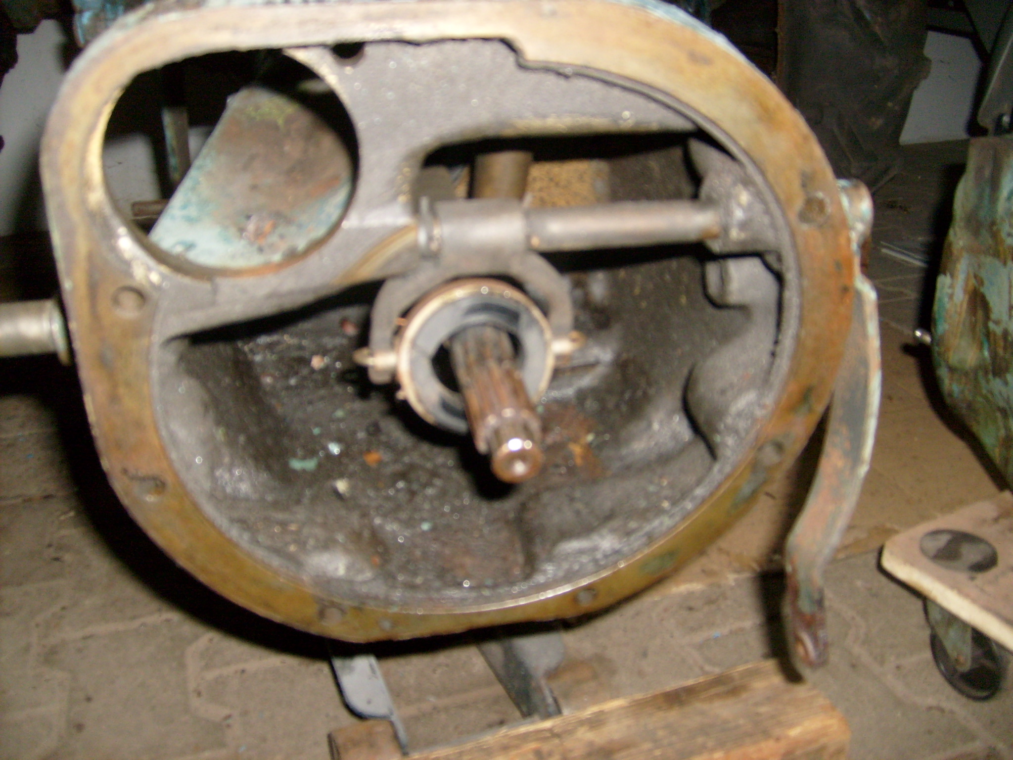 Bei der Demontage des Zwischenachsgeräterahmens muss man darauf achten, dass man nach dem lösen aller Schraubverbindungen zum Hauptgetriebe den Rahmen zunächst einmal soweit wie möglich nach vorne vom Getriebe abzieht. Man bleibt dann am Zahnrad hängen das das nächste Bild zeigt. Die Lösung ist einfach, man muss aber erst mal darauf kommen. Die Schaltgabel für die vordere Zapfwelle wird soweit nach vorne geschwenkt, bis die Schaltmuffe für die vordere Zapfwelle von der Welle fällt. Die Schaltgabel muss beim abziehen des Tragrahmens vom Hauptgetriebe nach oben geschwenkt werden, bis sie parallel zum Boden verläuft. Dann läßt sich das Zahnrad aus dem Tragrahmengehäuse fädeln.