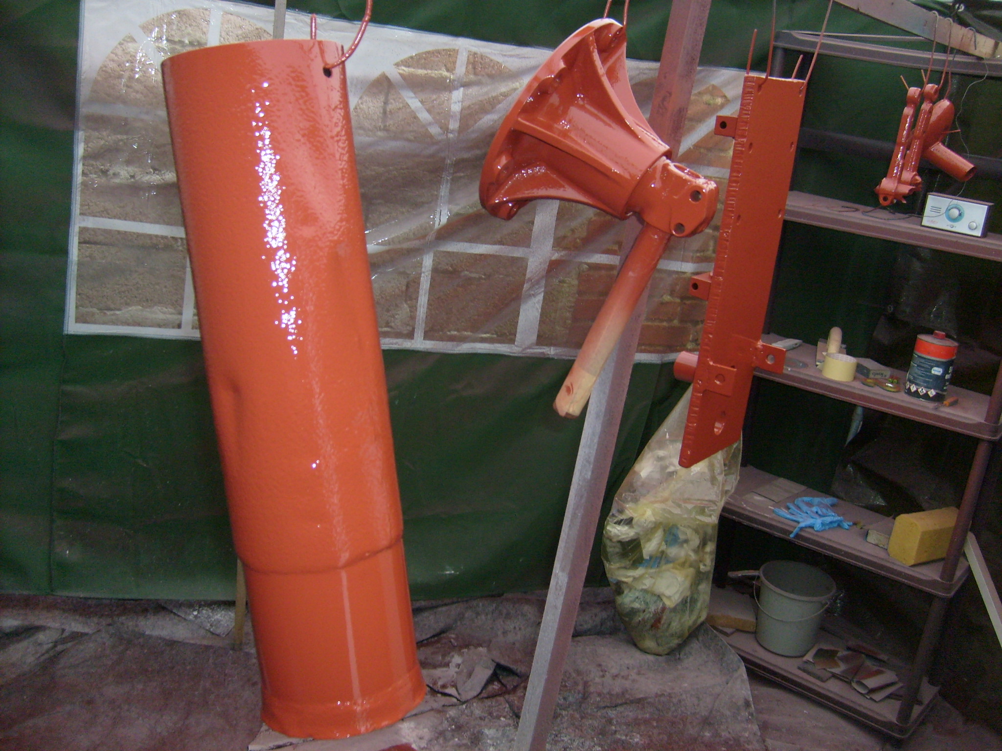 Nach den ganzen Stunden, eher Tage...Wochen(!) mit der Motorhaube mußte mal dringend wieder etwas Farbe in´s Spiel kommen. Also die Teile die zum grundieren bereit waren mit Silikonentferner gereinigt. Es waren die Vorderachsaufnahme, der Schalldämpfer, der Schalldämpferdeckel, beide vordere Radnaben, beide Lenkhebel. Viel mehr Gewicht hätte ich auch nicht an die Dachlatte hängen können. Oder nur einmal....