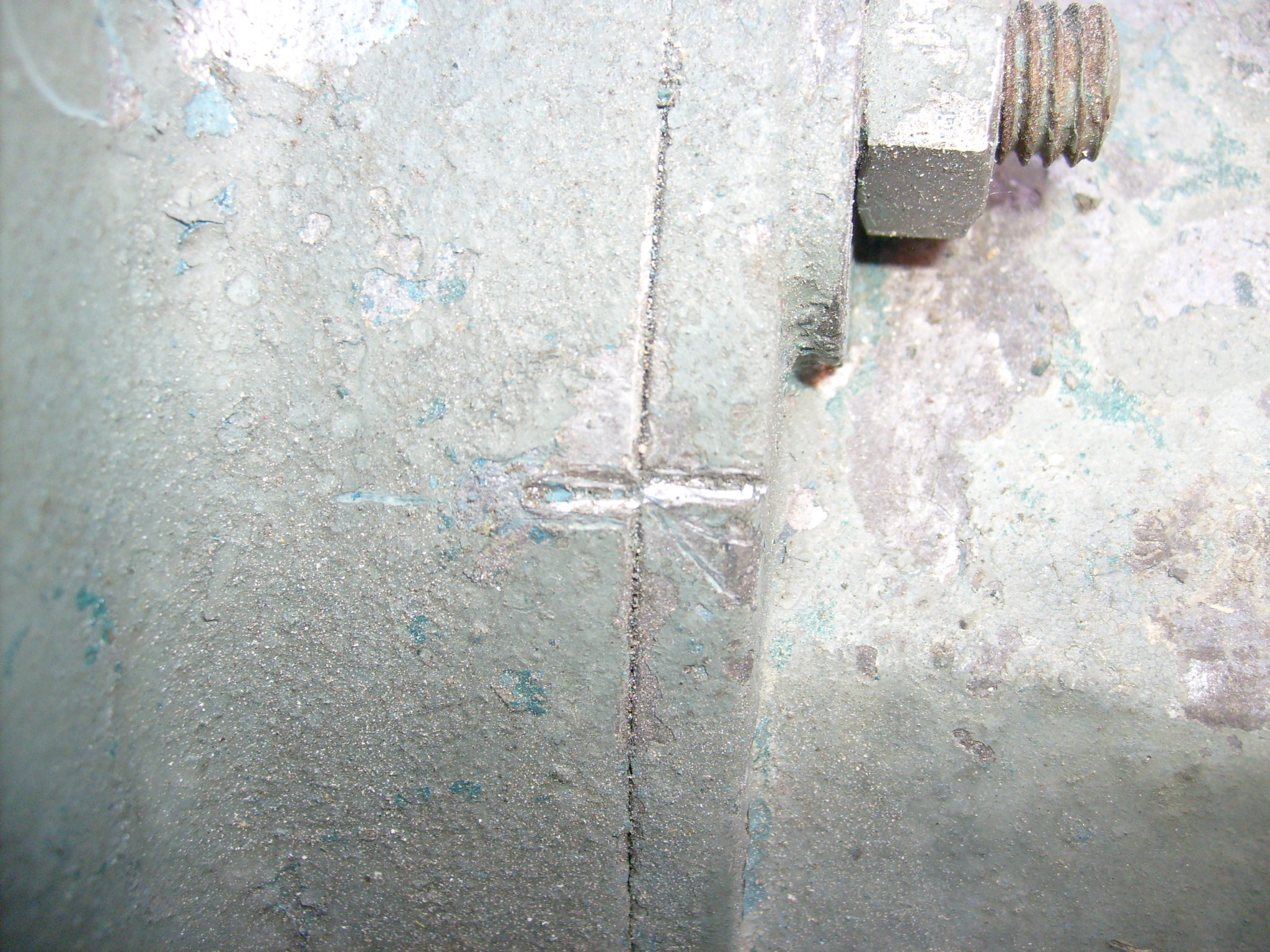 Vor der Demontage der Zahnräder wird sicherheitshalber die Lage zwischen Welle und Zahnrad markiert. Hier als Beispiel am Zwischenachs- Tragblock.