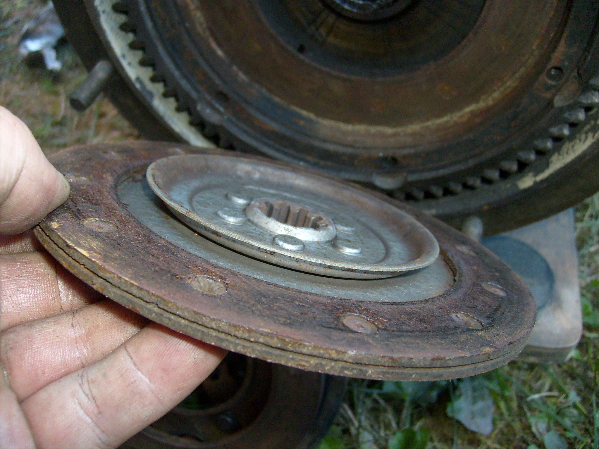 Kurios ging es schon wieder auf der gegenüberliegenden Seite weiter. Von außen betrachtet ist an der Kupplung absolut nichts ungewöhnliches zu erkennen. Druckplatte und Scheibe, alles ordinär. Aber was ist denn das bitte schon wieder auf der Rückseite der Reibscheibe? :shock: Kann denn nicht einmal etwas mit der Serie übereinstimmen, so dass man den freundlichen Teilelieferanten seines Vertrauens anruft, um eine gewöhnliche Ersatzreibscheibe zu bestellen? Nein! Werde die Reibscheibe dann an eine Firma schicken die mir da neue Beläge drauf macht...ach menno... :oops: