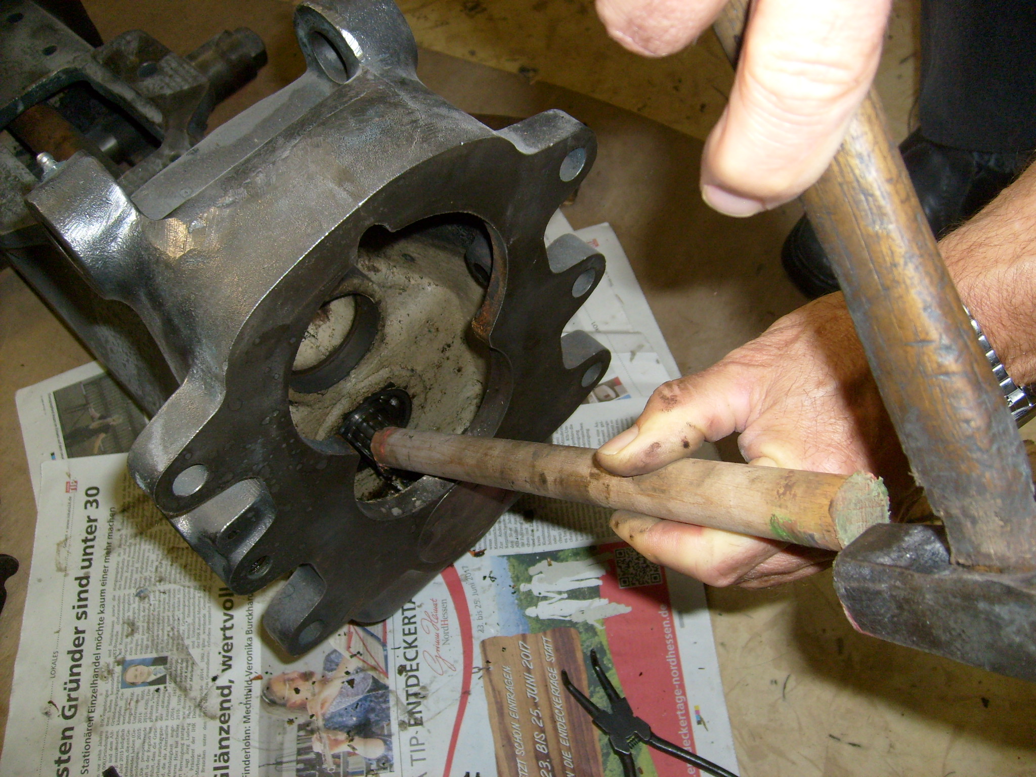 Die Wellen, Kugellager sowie Simmerringe wurden mit einem kurzen Rundholz hinausgetrieben, oder wenn ein längeres Rundholz erforderlich, mit einem Besentiel.