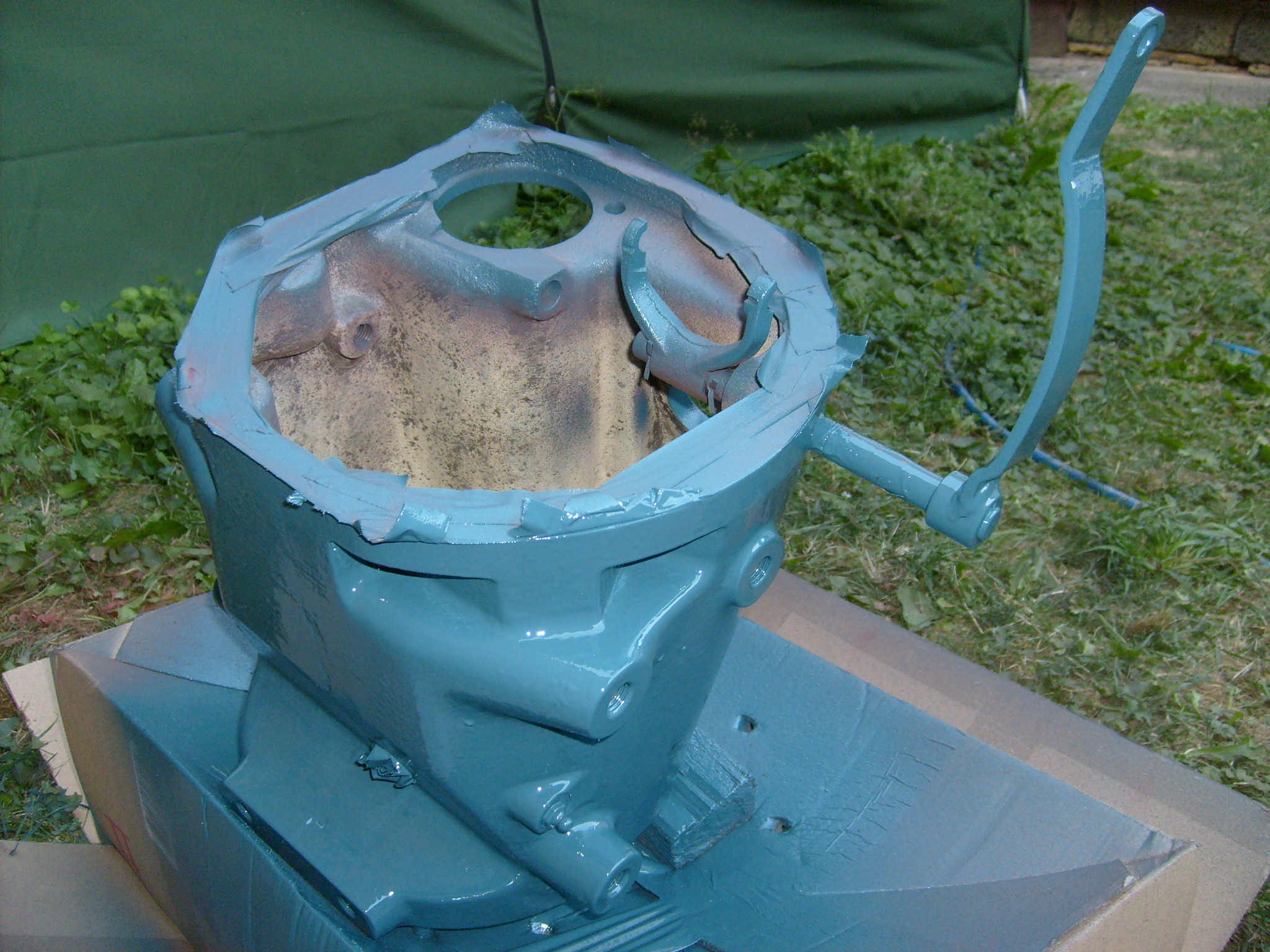 Die alten Lackschichten wurden erst mit 40 er und abschließend mit 80 er Papier angeschliffen. Ich brachte es nicht übers Herz die alte Patina komplett zu entfernen. Nun mussten noch diverse Gewinde mit Klebeband abgeklebt werden. Über den Zylinder wurde eine Plastiktüte gestülpt. Der Zylinder wird dann später wieder in schwarz lackiert.