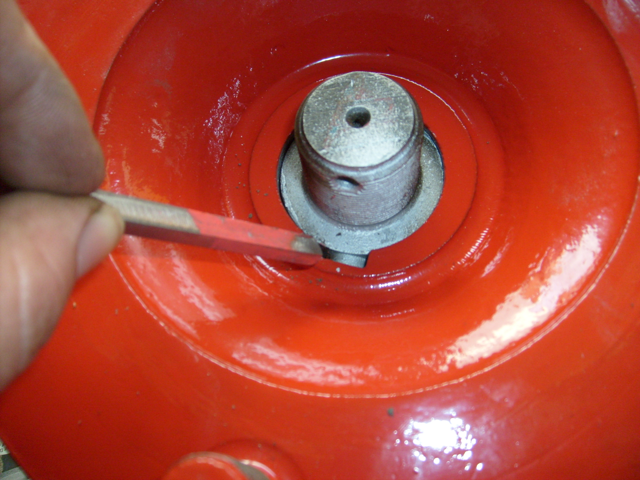 Der zweite Teil war schon kniffliger. Da die rechte Radnabe über einen größere Nut verfügt als der Keil in der Welle selbst breit ist, musste ein zweiter Keil angefertigt werden, der die Lücke ausfüllt. Dazu wurde ein Keil zunächst grob auf der Drehmaschine vorgefertigt. Die Feinabstimmung erfolgte dann durch ständiges probieren. Mit einem roten Edding wurde der Keil eingestrichen, in die Lücke eingetrieben, wieder ausgebaut und an den blanken Stellen an denen der Farbanstrich verschwunden war solange mit der Flex geschliffen, bis der Keil endgültig saugend eingetrieben werden konnte. 2 Stunden Aktion... :?