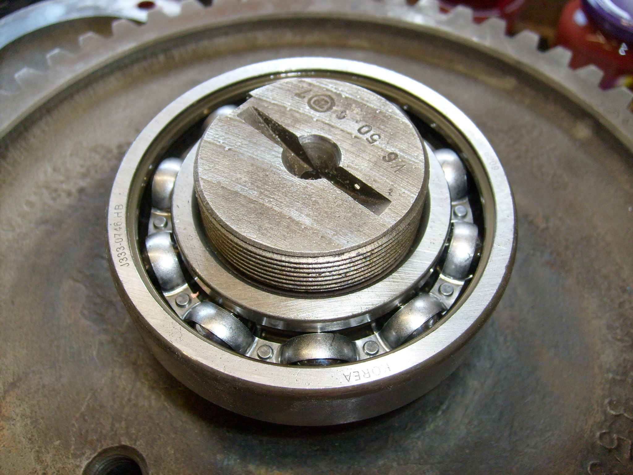 Die Sicherungsscheibe wird aufgelegt. Dabei spielt es keine Rolle ob das nach oben gebogene Stück nach oben in der Nut der Welle zeigt oder nach unten. Jetzt wird die Sicherungsmutter aufgeschraubt. Profis verwenden einen dafür geeigneten Hakenschlüssel. Spezialisten nehmen einen Durchschlag oder Splintentreiber der von einem Hammer angetrieben wird... :lol: Die abgerundete und schmalere Seite der Mutter zeigt dabei auf das Sicherungsblech. Man wird nach dem festziehen oder schlagen feststellen, dass man das Blech zum sichern nicht so ohne weiteres hochbiegen kann. Es sei denn man hebelt am neue Kugellager herum was aber nicht die Ideallösung ist. Mit einem farbigen Stift zeichnet man sich nun ein Stück Blech an, dass direkt gegenüber einer Nut in der Mutter sitzt.