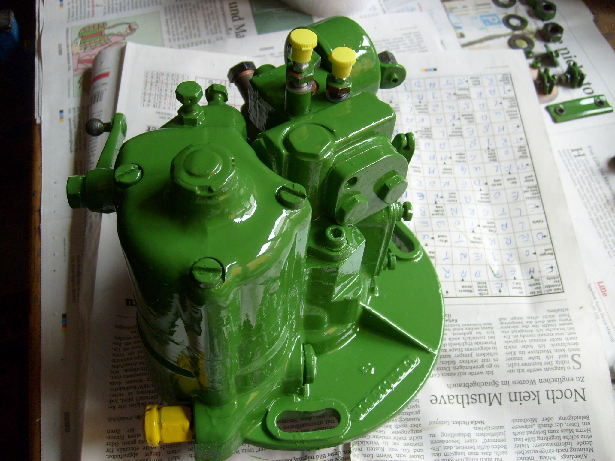 Da man im eingebauten Zustand beim D1206 nur schlecht an den Regler herankommt wurde die Gunst der Stunde genutzt und der grasgrüne Pinsel geschwungen :D ... Während der Trocknungszeit wurden die beiden Ölleitungen am Motor an den Stellen wo die Halteklammern sitzen mit Bremsenreiniger entfettet und mit Grundierung versehen. Im Werk wurden erst die Halteklammern an die Ölleitungen montiert und dann lackiert. Da wo die Halteklammern sitzen ist dann die blanke Leitung. Nachträgliche Grundierung kann also nicht schaden. Hier der frische Regler...