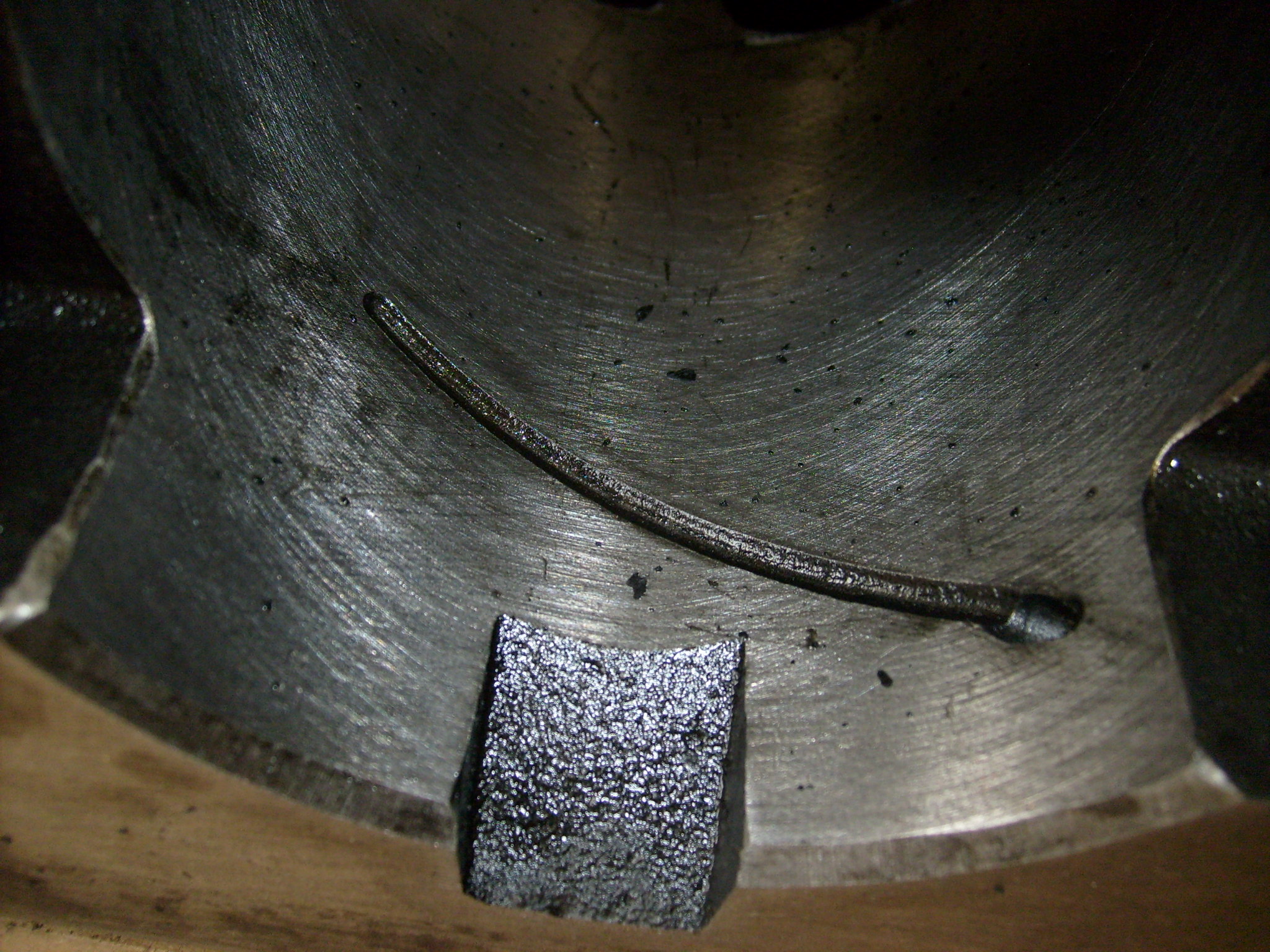Wenn der Zylinder von 85 mm auf 85,5 mm aufgebohrt wurde, muss man nicht gleich mit Kanonen auf Spatzen schießen und die Ölnuten mit einem Dremel und Trennscheiben nachschleifen. Hier reicht ein passend gebogener und mit der Feile angespitzter Drahthaken vollkommen aus, um die Ölkohle zu entfernen.