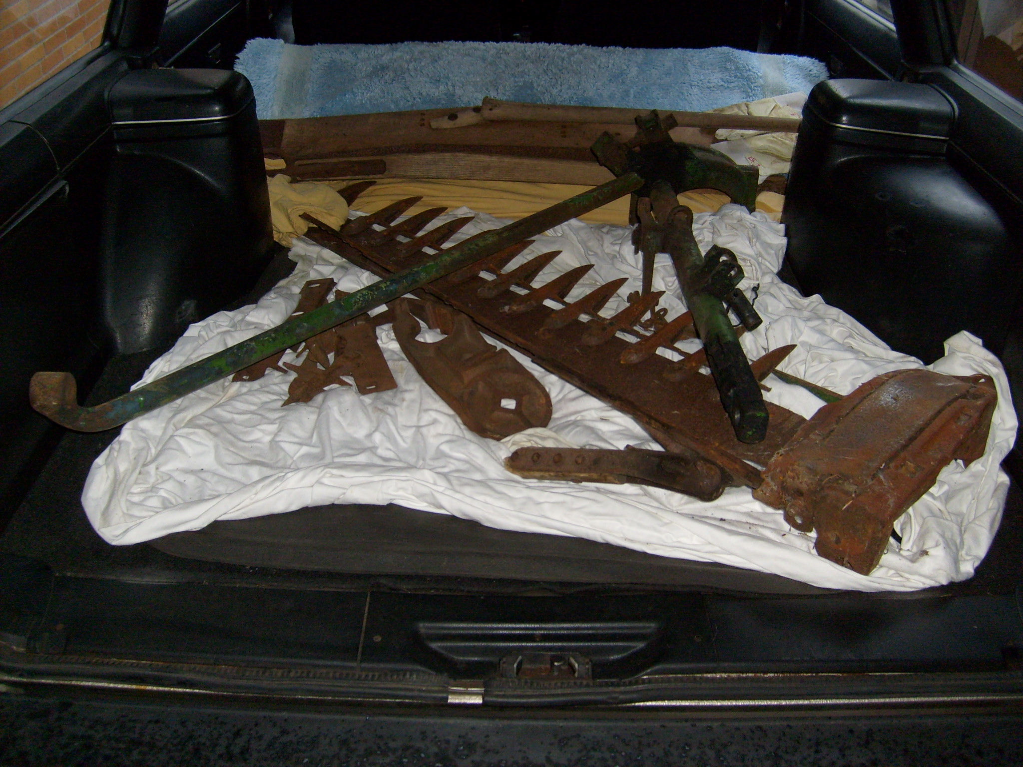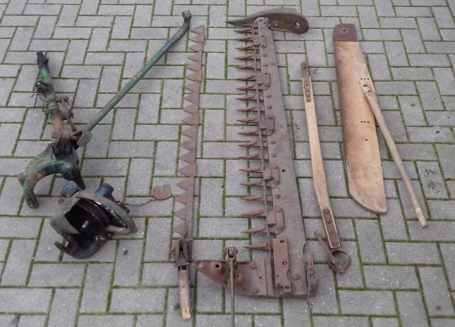 Ein Lanz Normalschnitt Mähwerk, geeignet für Gras- und Getreideschnitt, fast vollständig. Die auf dem Bild fehlende Messerstange sowie die Montageplatte unter dem Schlepper hatte ich noch im Regal. Jetzt fehlt nur noch die Halteplatte für das Mähwerk, die das Mähwerk während der Strassenfahrt oben hält, bei entlasteter Hydraulik. Hinzu kommt noch der Fingerschutz, die Haltestange und der innere Abweiser am inneren Schuh.