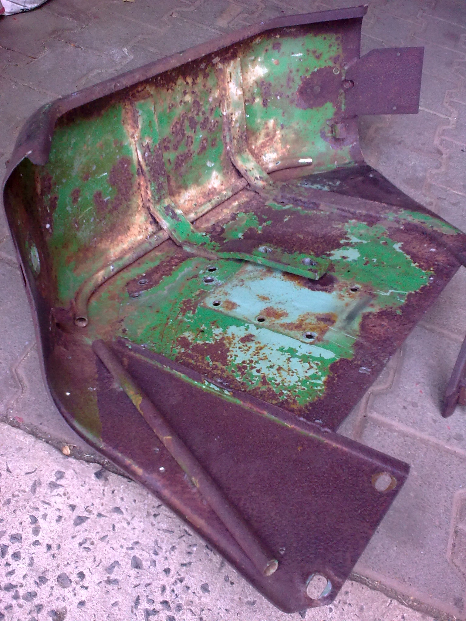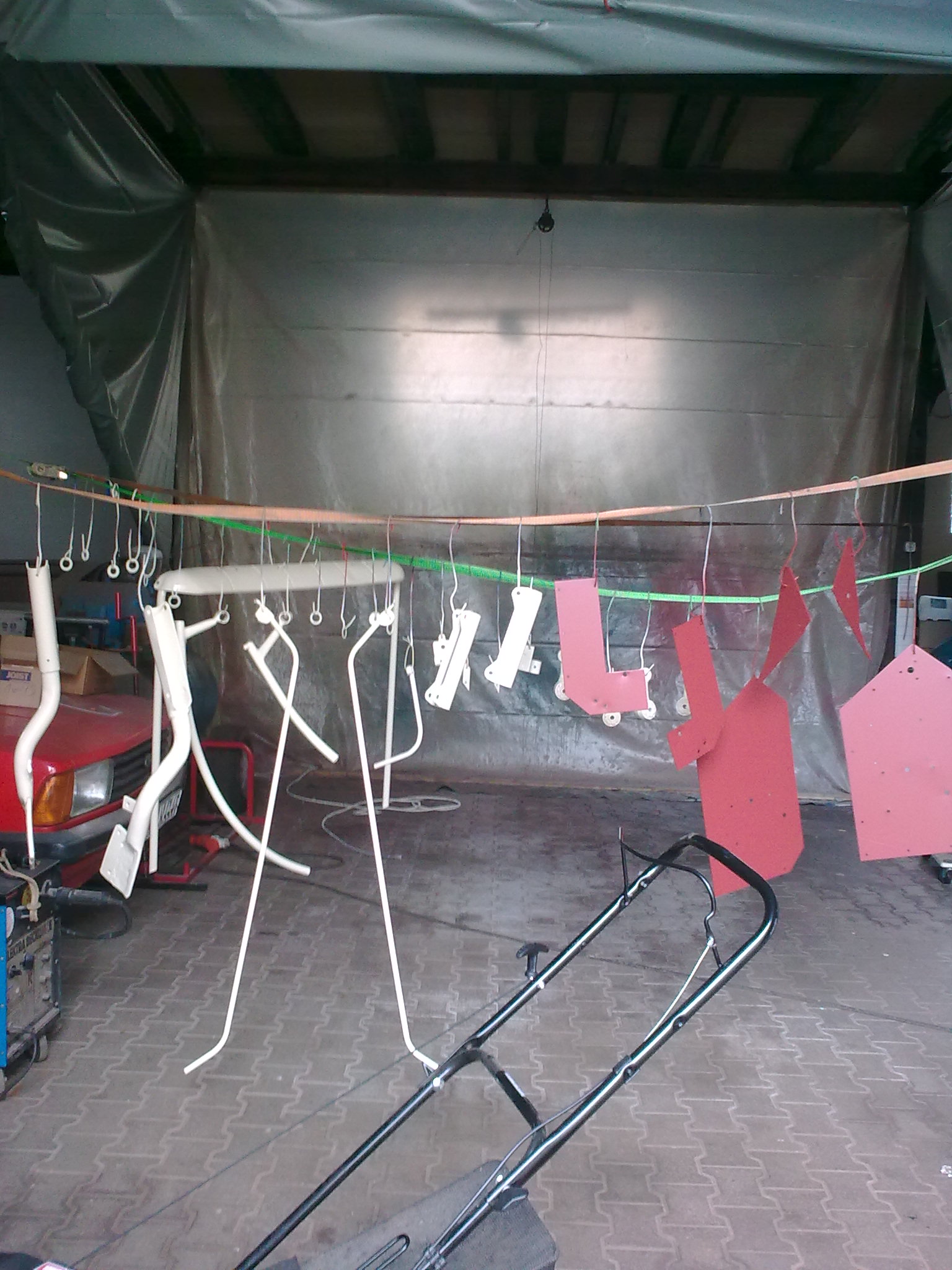 Ansicht von innen, Einstieg. Um die Frontplane vom Scheinwerfer fern zu halten habe ich in unserer Scheune noch Lochband gefunden, das mal irgendwann beim Renovieren gebraucht wurde. Heizungsraum zum hochalten diverser Leitungen? Auf jeden Fall ging das ganz prima. Eine Lochschiene kam nahezu flach aufliegend an die Frontplane, die eine kommt etwas überspannt und somit versetzt verschraubt auf der ersten Lochschiene zum Einsatz. Dadurch kommt "Spannung in die Plane, der diese zum fahrer hin nach innen zieht. Das Ganze ist aber immer noch so geschmeidig, dass man die Tür ganz aufmachen kann, ohne dass die Plane zu stark gespannt wird. Schlicht und einfach, billig, aber gut.