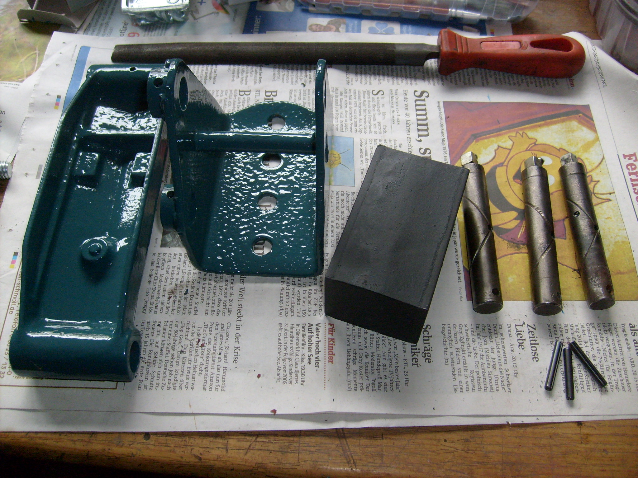 Alles mit neuem Schraubmaterial. Die alten M8 er Schrauben mit den 14 er Köpfen sind leider fertig mit der Welt. Aber eine schöne Deko für´s Wohnzimmerregal... :)
