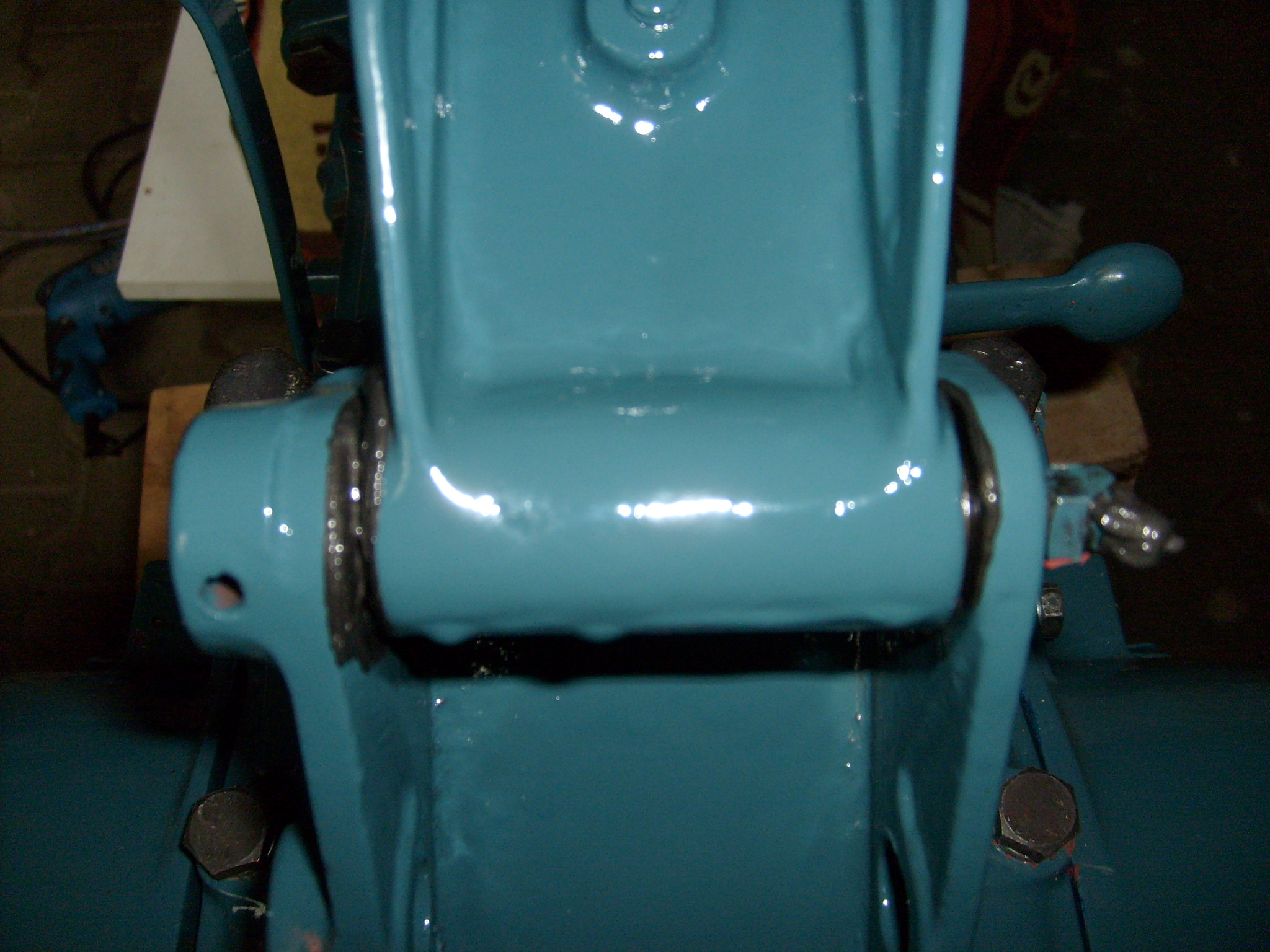Die Konsole selbst wurde schon auf den Getriebedeckel geschraubt und gleich mal frisches Fett in den noch verbliebenen Bolzen gedrückt. Dadurch das in den Bolzen umlaufende Schmiernuten eingefräst sind drückt sich das Fett beim pressen zunächst erst nur in einer Richtung heraus, im Bild links. Aber wenn man den Halter auf seinem Bolzen dreht sieht man nach einigen Bewegungen, wie das frische Fett auch auf der rechten Seite heraus kommt. Das funktioniert natürlich nur bei freien Nuten. Die Reinigung bei den anderen drei Bolzen war leicht, bei dem eingebauten Bolzen reichte die enorme Hitze des Brenners, um das frei zu brennen. :)