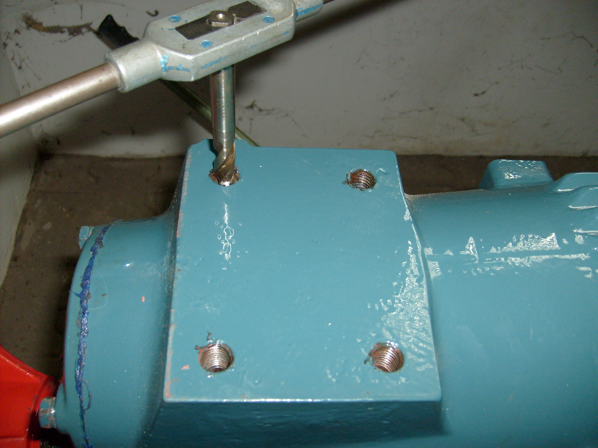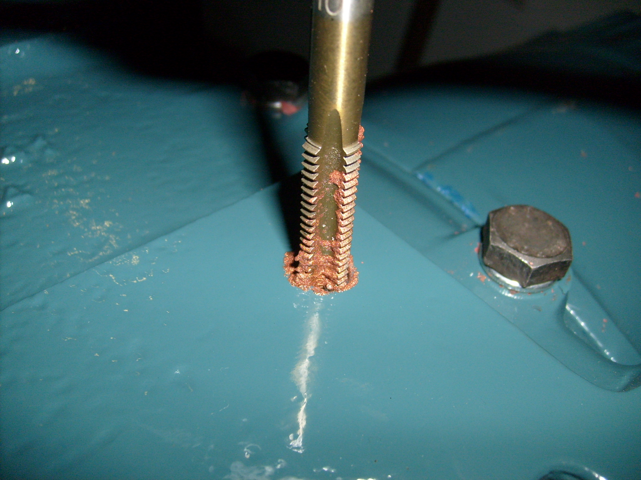 Beim lackieren trat natürlich auch Grundierung und Lack in das Gewinde. Damit die Schrauben leicht eingeschraubt werden können wurden die Gewinde mit dem Gewindeschneider gereinigt. Dazu gibt man einen Tropfen Motoröl an den Schneider...