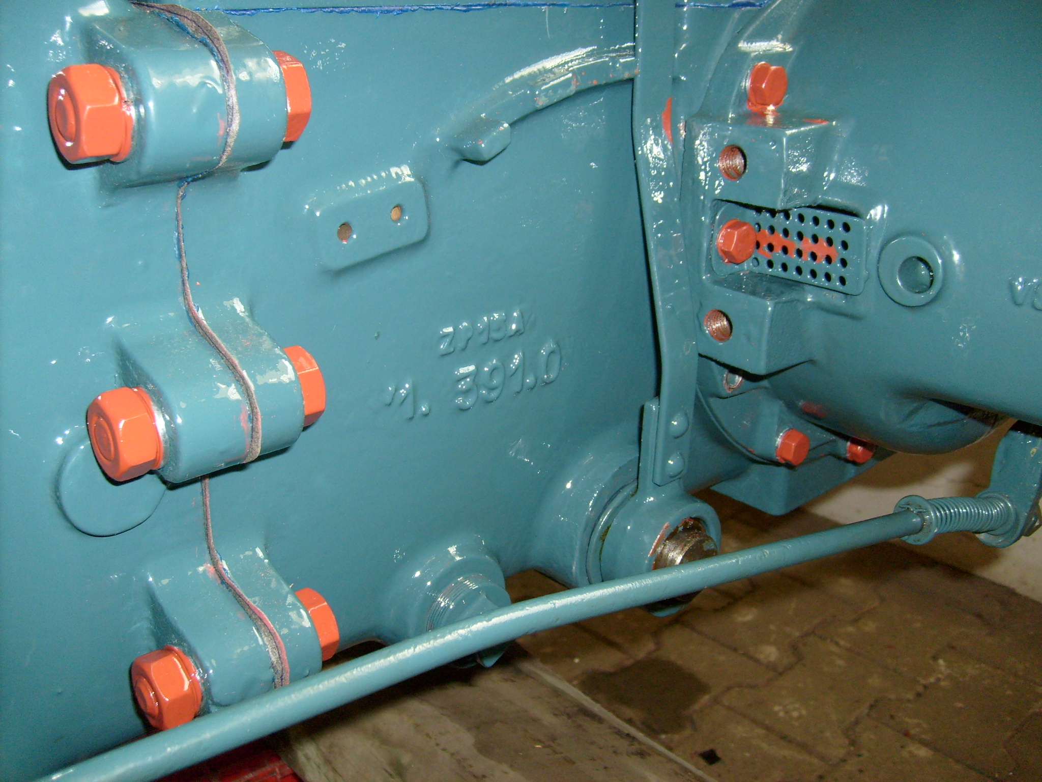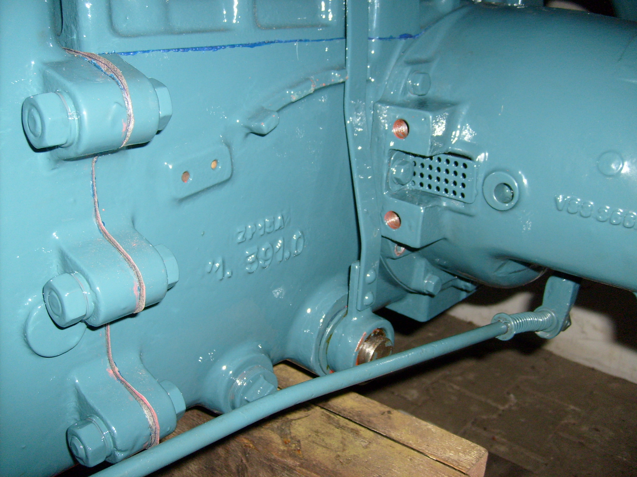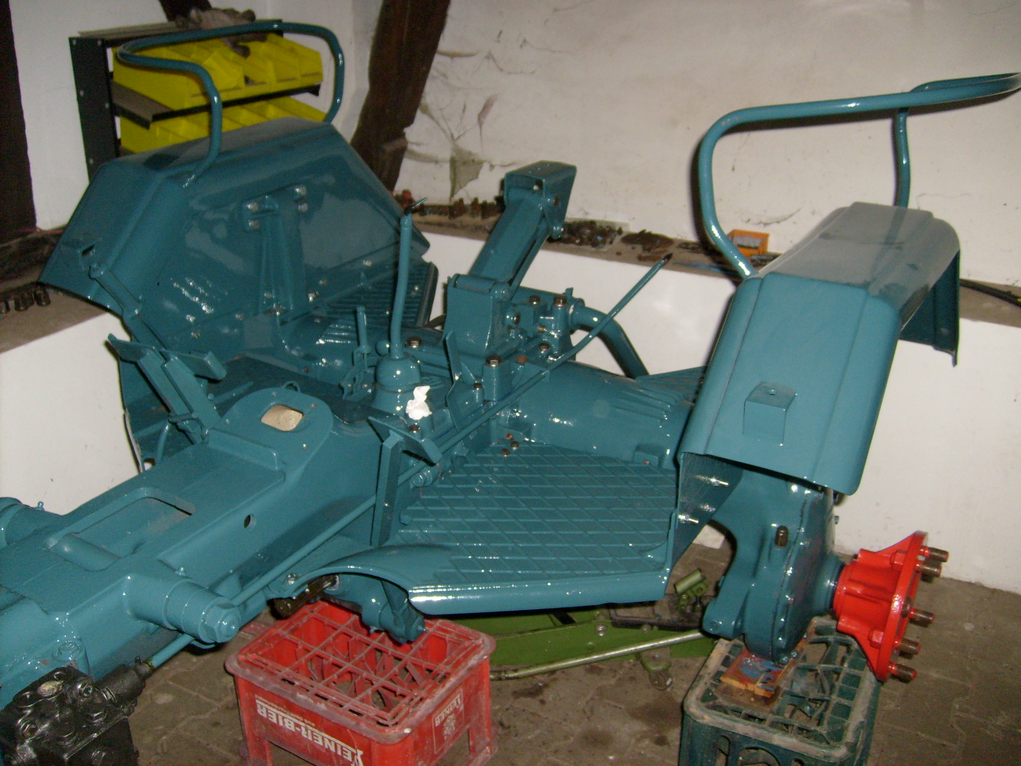 Gestern war der große Moment gekommen: Montage der vorderen rechten Bodenplatte und des rechten Kotflügels. Wichtig ist hierbei die Einhaltung der richtigen Reihenfolge. Schraubt man alles zusammen und sieht dann den Handbremshebel noch im Teilelager liegen hat man ein Problem. Den hatte ich zwar nicht vergessen, aber wenn man nur zwei Hände hat kann es dennoch kniffelig werden, vor allem wenn man den neuen Lack nicht unnötig dabei verkratzen möchte. Hilfreich war auch hier das unterstellen einer Bierkiste im Hochformat plus Holzunterlagen, die bis unter das Zahnsegment der Handbremse reichten und somit die Bodenplatte in waagerechter Position gehalten wurde. So kann man dann auch den Kotflügel ansetzen und die Schrauben einstecken und leicht vorziehen. Man zieht dann erst die Schrauben an der Kotflügelstütze an, aber noch nicht fest, in unserem Fall die vier M10 er Schrauben, gefolgt von den M8 Schrauben, die die Kotflügel mitsamt Bodenplatten verbindet. Sobald man die Schrauben leicht angezogen hat setzt man erst die hintere Bodenplatte auf den vorher schon montierten Halter am Achstrichter, den man aber auch nicht festschraubt sondern so das er sch noch von Hand drehen lässt. Man sollte dies im lackierten Zustand nicht alleine tun. Daher haben wir diese Arbeiten mit zwei Mann erledigt. Einer hält die Bodenplatte, einer steckt die Schrauben ein und setzt die Muttern an. Jetzt werden erst die Schrauben von der hinteren Bodenplatte vorgezogen und dann beginnt man mit dem Festziehen der vier M10 er Schrauben, gefolgt von den M8 er Schrauben. Wenn Kotflügelstütze und Kotflügel fest verschraubt sind zieht man als nächstes die beiden M8 er Schrauben an dem Halter am Achstrichter vorne fest, wobei auch der Halter, der mit einer M14 er Schraube am Achstrichter befestigt ist, sich dabei noch drehen lassen muss. Diese beiden Schrauben befestigen gleichzeitig ein Winkeleisen, in die man die Bremsenrückzugfeder einhängt. Das ist in der Ersatzteilliste nicht auf einem Bild dargestellt sondern auf zwei unterschiedlichen Skizzen, daher ist das schnell mal vergessen anzubringen. Dann zieht man die beiden M8 er Schrauben (beim Prototyp) bzw., die beiden M10 er Schrauben (beim Serien 13 er) am Haltewinkel vorne an der Bodenplatte an, die auch die Gasgestänge- Umlenkung befestigen. Es werden also erst die M8 er Schrauben angezogen, dann die größeren an den Ahstichtern (M14) und dann die M10 er die den Haltewinkel unter dem Tragblock befestigen. Der Haltewinkel verfügt über 10mm breite Langlöcher, daher kann man den zum Schluss anziehen, wenn sich alles andere durch anziehen der Schrauben ausgerichtet hat. Würde man erst die M14er Schrauben der Winkel an den Achstrichter fest anschrauben geht man Gefahr, dass der Winkel nicht genau zu den Bodenplatten steht und sich die M8 er Schrauben beim anziehen dann verspannen oder sogar beschädigt werden.