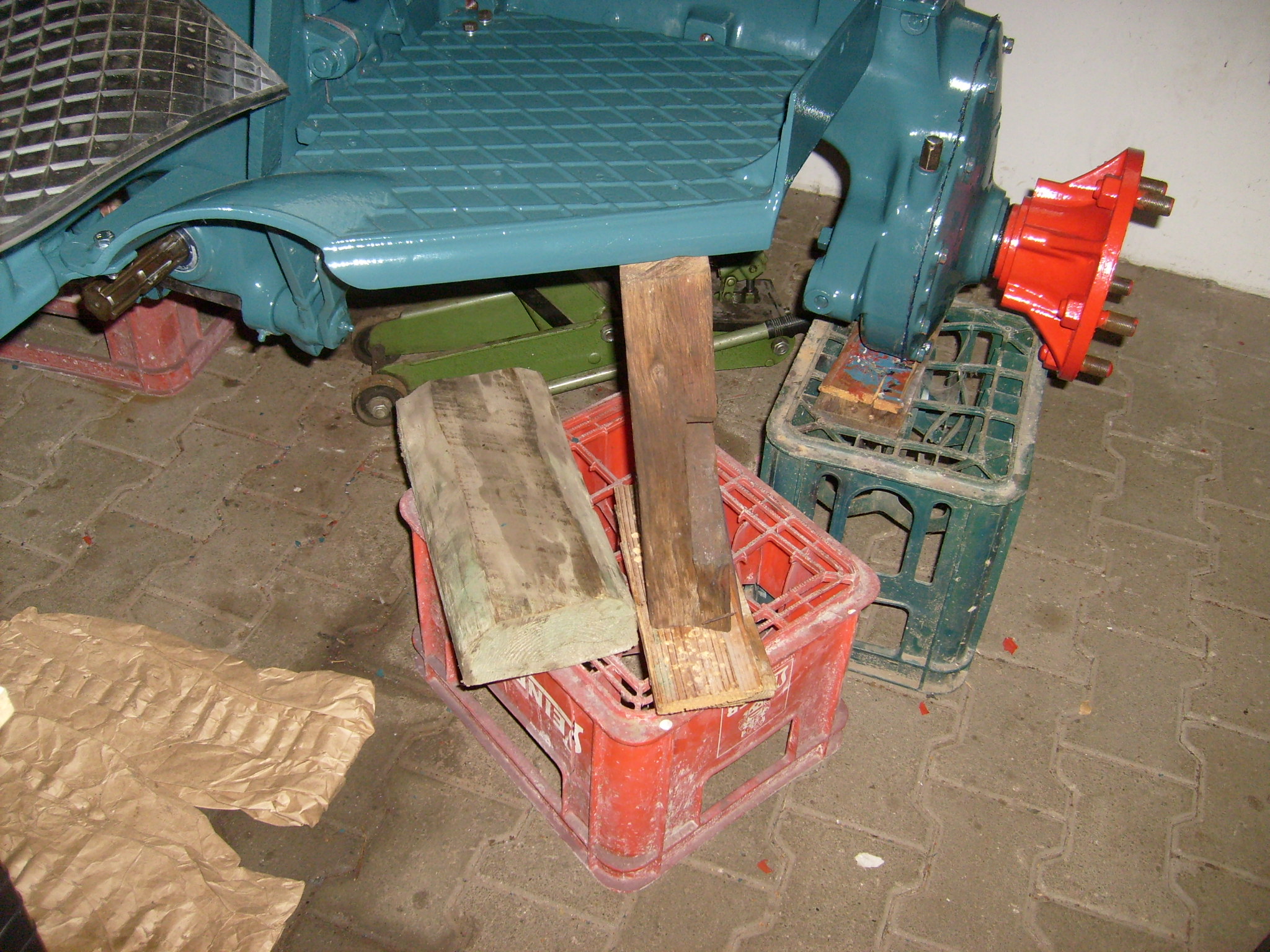 Heute war die andere Seite an der Reihe. Zuerst die Bodenplatte auf den Winkel legen der vorher an dem Achstrichter montiert ist und vorne auf den Traggwinkel, der unter dem Tragblock verschraubt ist. Damit das nicht runterfällt gleich die zwei M8 er Schrauben hinten und vorne die M8 er Schrauben einstecken. Nun wird die vorher parat gelegte Bierkiste, Wasser oder Limokiste sollte auch funktionieren :wink: , sowie diverse Brettchen und Kantholz so darunter angebracht, dass sich die Bodenplatte in etwa waagerechter Position darauf abstützt. Jetzt die Federringe und Muttern ansetzen, hinten wieder den Metallwinkel nicht vergessen, in die eine Rückzugsfeder für das Kupplungspedal eingehängt wird, die bei mir aber nicht mehr dabei war...