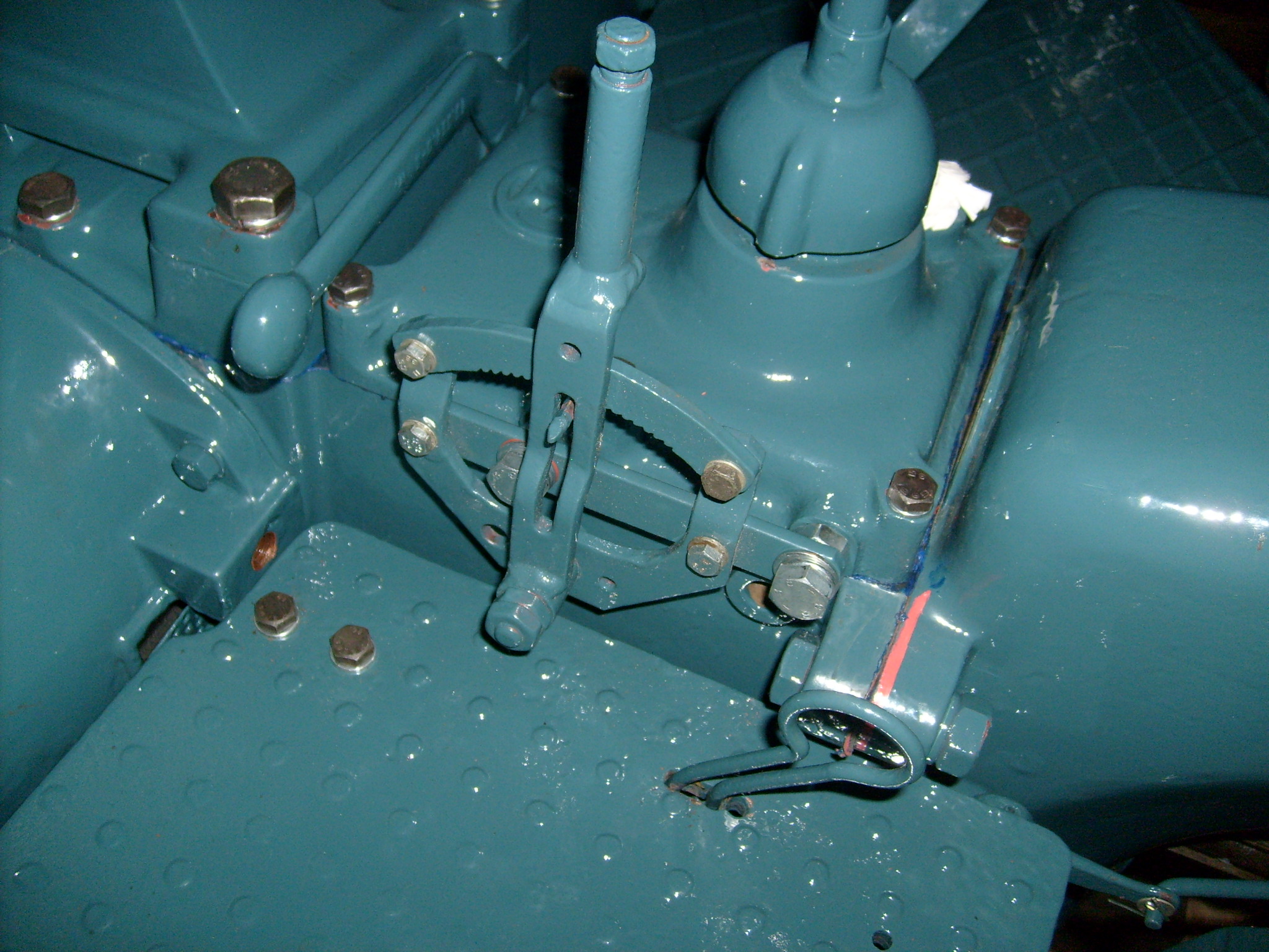 Interessant auch die Handgasausführung beim Prototyp. Sie wurde von den kleinen Halbdieseln übernommen und nur leicht verändert, um das seitlich am Schaltdeckel anschrauben zu können. Ganz abgesehen vom Zapfwellenschalthebel für die vordere Zapfwelle, der sich nun vollkommen von allen sonst bekannten Schalthebeln unterscheidet....