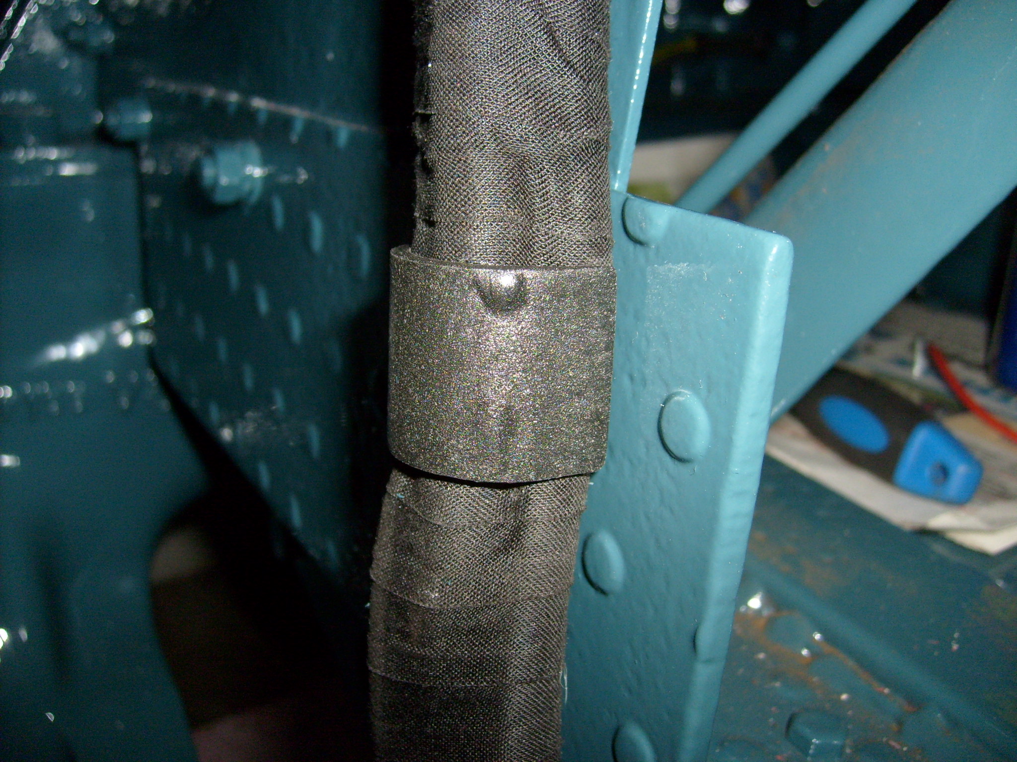 Bei uns wird international gearbeitet. Zur Herstellung zweier Kabelhalterungen fanden sich im Regal Haltebügel aus 2mm starkem Metall, mit denen die Achsschenkel der Rasentraktoren auf Ihrem Weg nach Europa in Ihren Transportgestellen festgenagelt werden. Der Durchmesser der Aufnahme passte für unseren Kabelbaum wie die Faust auf´s Auge. Die eine Seite des Bügels musste nur abgeflext werden. So wird aus einem Bügel eine Klammer. Genial einfach. Sogar die 8 mm Bohrung passte.