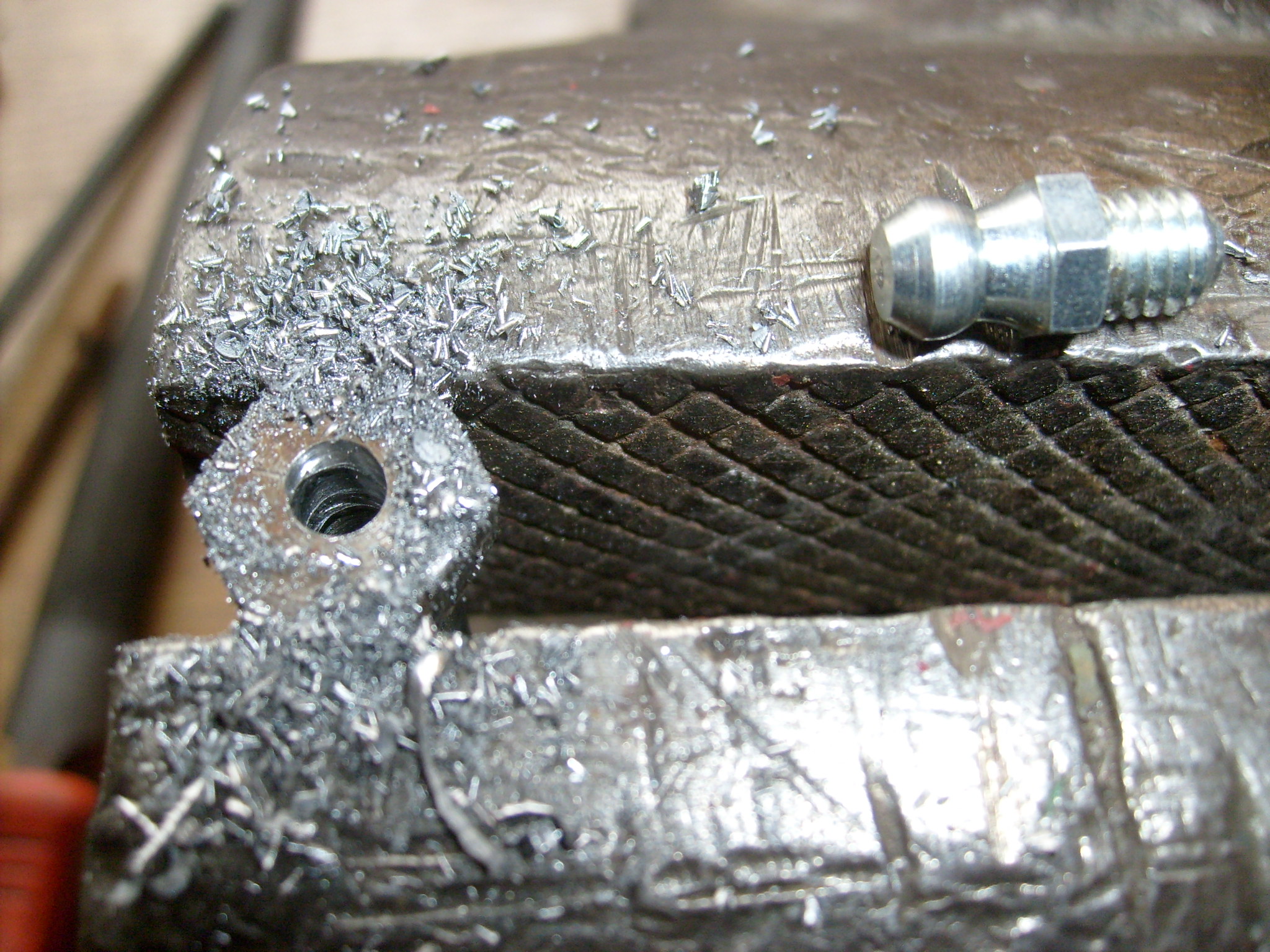 Auch bei diesem Motor habe ich aufgrund der guten Erfahrungen beim E103 des D1206 die beiden Hohlschrauben für die Ölleitungsmontage an der Ölpumpe mit Schmiernippeln versehen. Dafür zunächst einmal möglichst mittig ein 5 mm Loch bohren und M6 mal 1 Gewinde einschneiden.