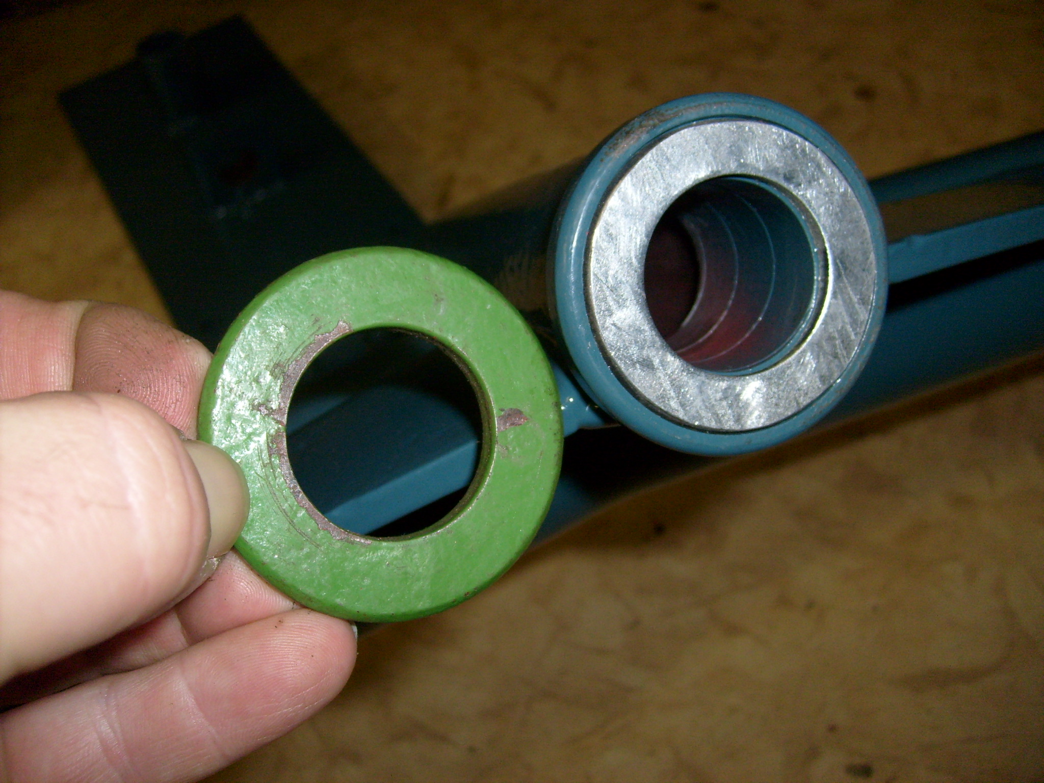 Die kleinen Distanzringe wurden bei der Vorderachsmontage benötigt. Einmal zum Spielausgleich für die Achsschenkel in der Vorderachse und einmal für die Distanzierung des Vorderachsbolzens. Zusätzlich wurden aber drei Druckscheiben benötigt, die sich auf dem Außendurchmesser auf die Achse selbst abstützen und nicht nur auf die eingepressten Buchsen. In dem benötigten Außendurchmesser war aber nichts zu bekommen, daher wurden drei Unterlegescheiben, je 5 mm stark, mit der Flex solange rundherum abgeschliffen bis sie rein passten. Links im Bild einer der Scheiben im Ursprungszustand, rechts fertig geschliffen und eingesetzt.