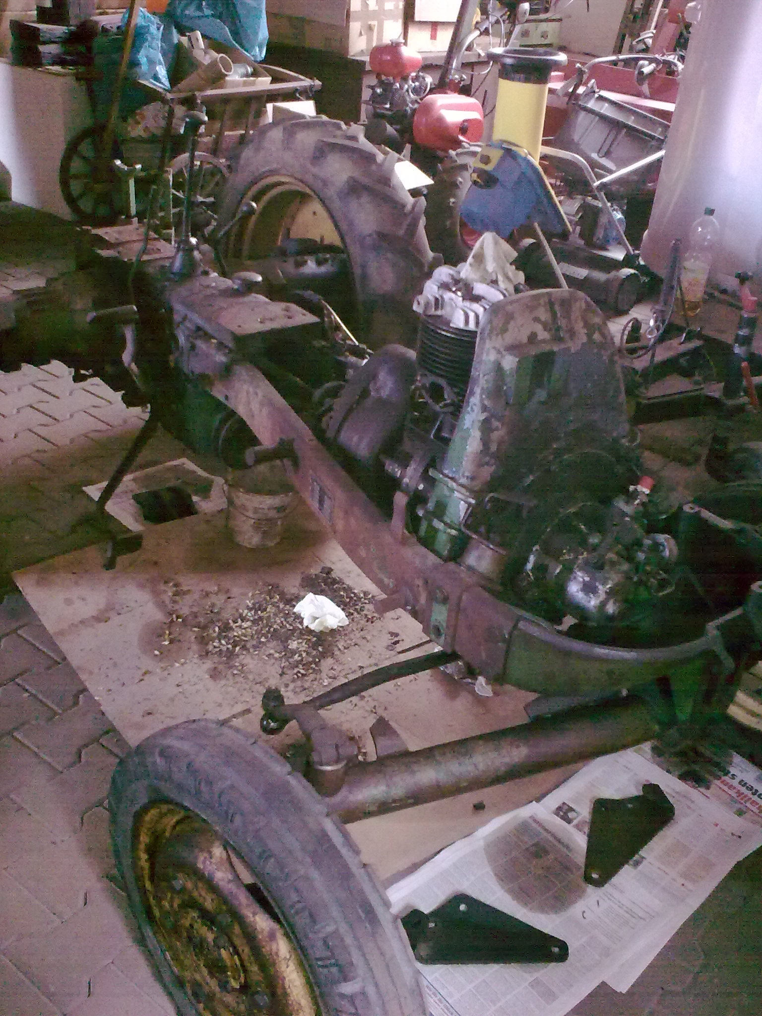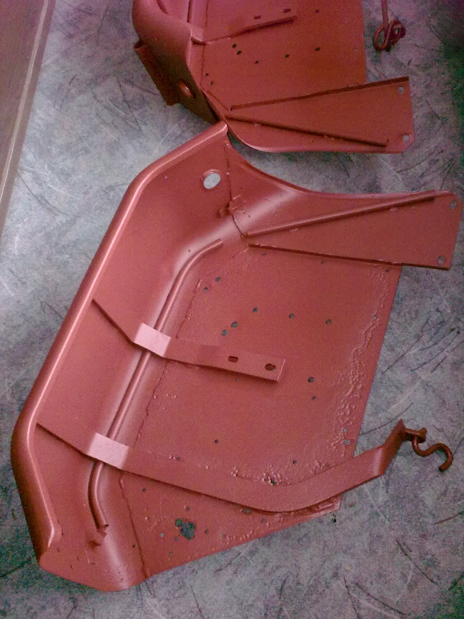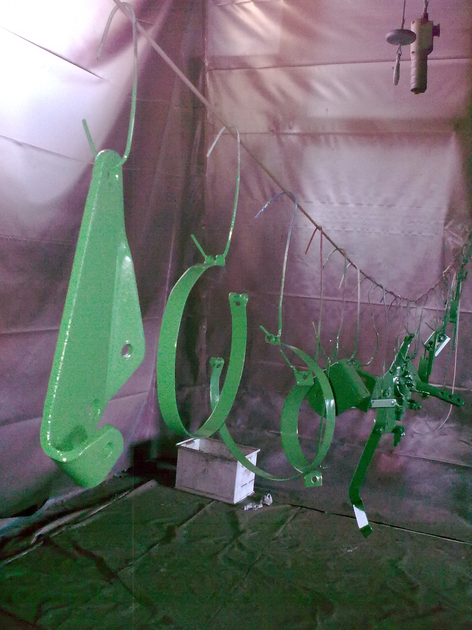 Hier mal ein Bild von den ersten grün lackierten Teilen, die jetzt seit einer Woche im Heizungskeller zum Trocknen hängen.