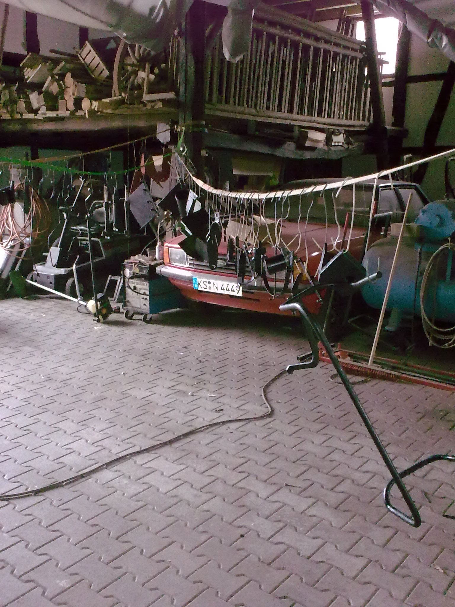 Hier ein Großteil der vom Bulldog abgeschraubten Teile, aufgehangen an Spanngurten. So kann man die verschiedenen Arbeitsgänge gut meistern, ohne die Teile zig mal ab- auf- und umzuhängen.