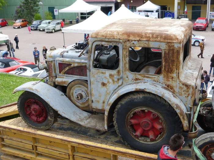 Tank-Einfüllstutzen im Führerhaus zwischen Scheibe und Lenkrad,vielleicht kam das Führerhaus doch erst später drauf? Die aufwändigen Felgen sind original bei der "Versione Stradale".