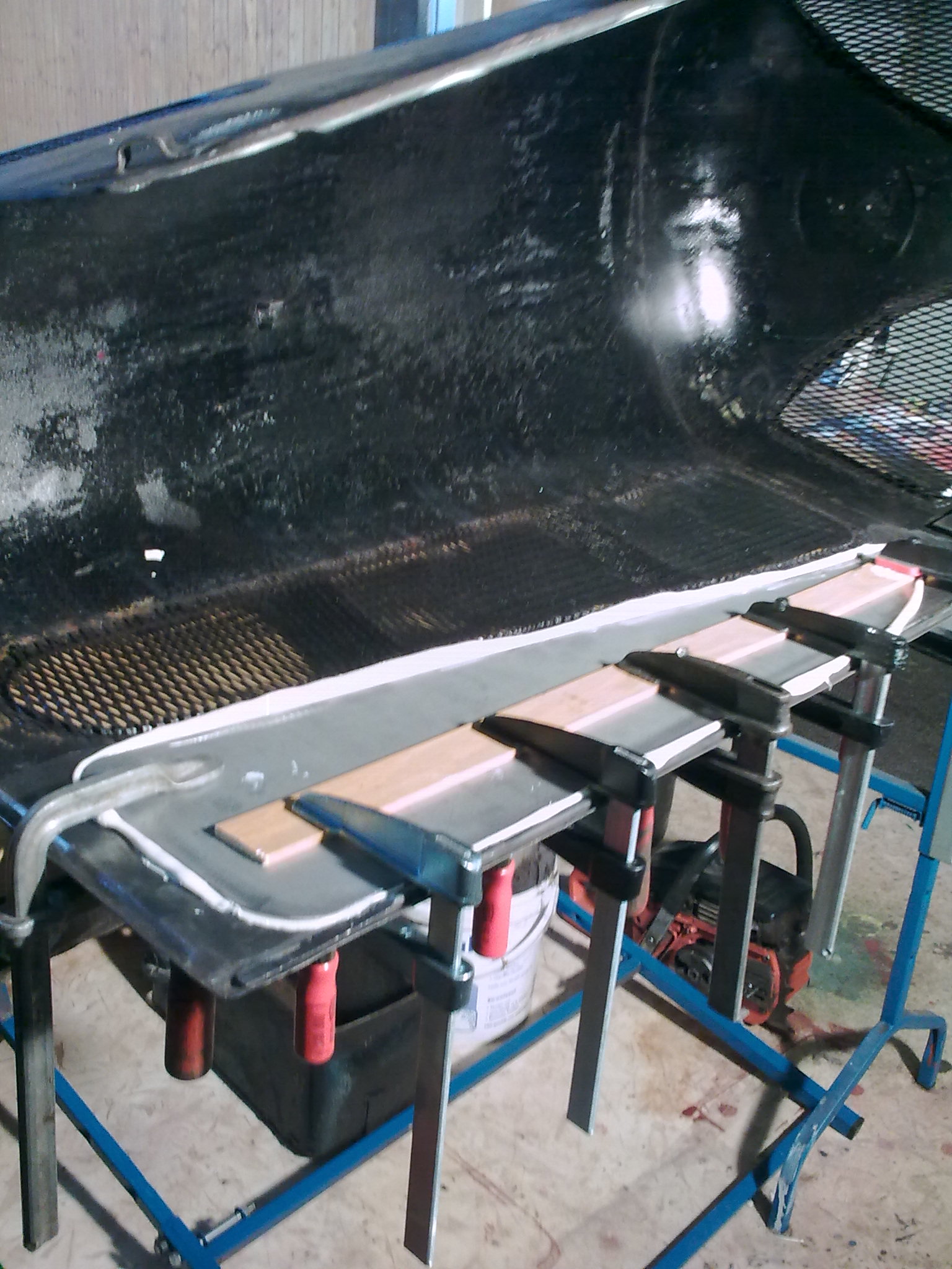 Am Donnerstag habe ich mal ganz gemütlich angefangen mit den beiden Katzenaugenhalterungen, dem Werkzeugdosendeckel, der Auspuffschelle und der Batteriehalterung und der Bestellung der beiden Hardyscheiben. Heute habe ich die neue Zierleiste auf der Haube angepaßt und einen Vorderradkotflügel gebaut, der andere folgt morgen. In der Werkstatt liegen schon ein neuer Luftansaugschlauch, dass Pilotlager sowie der Dichtring für das Lenkgetriebe. Sie werden im Laufe der nächsten Woche angefertigt bzw. montiert.
