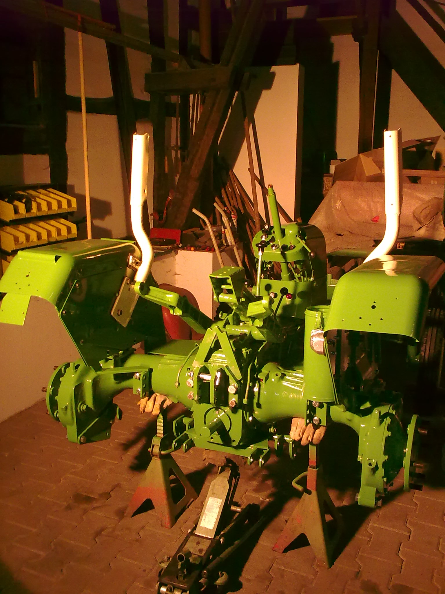 Am Wochenende habe ich mal angefangen den Schlepper zu montieren. Beim D1106 Bulli und auch beim D1206 ist dabei die Einhaltung der richtigen Reihenfolge zu beachten. Dies trifft vor allem im Armaturenbreich zu, weil dort "alles" auf engem Raum zusammenläuft. Auf der einen Seite ist dies schön für die tolle Optik, auf der anderen Seite verlangt es nach Aufmerksamkeit beim Zusammenbau. Generell wird immer zuerst das Kupplungspedal und das Gaspedal mit seinen beiden Gestängen montiert, einmal Handgas- und einmal Fußgasgestänge. Jetzt sofort die beiden Hydraulikleitungen von bzw. zur Hydraulikpumpe verlegen. Bei vorhandener Heckhydraulik auch diese Leitung. Erst danach wird das Armaturenunterteil auf dem Getriebetunnel montiert und mit zwei Schrauben befestigt, die nicht auch durch das Lenkgetriebe gehen. Nun fädelt man vorsichtig das Lenkgetriebe zwischen den Hydraulikleitungen hindurch und steckt die Welle durch die Öffnung im Armaturenunterteil. Die Vorsicht bezieht sich hier eher auf den schönen neuen Lack als auf die Hydraulikleitungen. Wer jetzt schnell Ergebnisse sehen will und gleich das Oberteil drauf montiert, wird sich kurze Zeit später fragen, wie er denn das Hydraulik- Steuerelement befestigen soll. Also nach dem Unterteil kommt erst die hydraulische Steuereinheit drauf. Jetzt gleich die Hydraulikleitungen festziehen. Bevor das Oberteil auf dem Lenkrohr aufgefädelt wird, sollte man das Lenkrohr reichlich z.B. mit WD 40 einsprühen. Die Passung ist für lackierte Teile zu eng gewählt. Wieder schön für die spätere Optik, aber... .Im Werk wurde bekanntlich erst montiert, dann gelackt. Manche "Probleme" bereitet man sich natürlich selber gerne. Leichte Kratzer werden sich bei der Montage hier nicht vermeiden lassen. Für die Einen ist es dann halt wieder Patina. Aber es gibt ja auch noch Rollen und Pinsel. Das Ober- und Unterteil sollten nicht blindlinks zusammengeschraubt werden, weil in der Mitte der beiden Teile noch Bohrungen sind, die die Batteriehalterung aufnehmen. Am besten vor dem verschrauben je eine 6 er Schraube hindurchstecken, erst danach Ober und Untereil zueinander ausrichten und veschrauben. Kann man nach dem zusammenschrauben beide Schrauben wieder herausziehen, klappt auch die spätere Montage der Batteriehalterung problemlos. Diese sollte man erst nach dem Einbau der elektrischen Anlage montieren. Man hat so mehr Bewegungsfreiheit. Dies gilt auch für das Gitter im Armaturenbrett und auch für das Lenkrad.