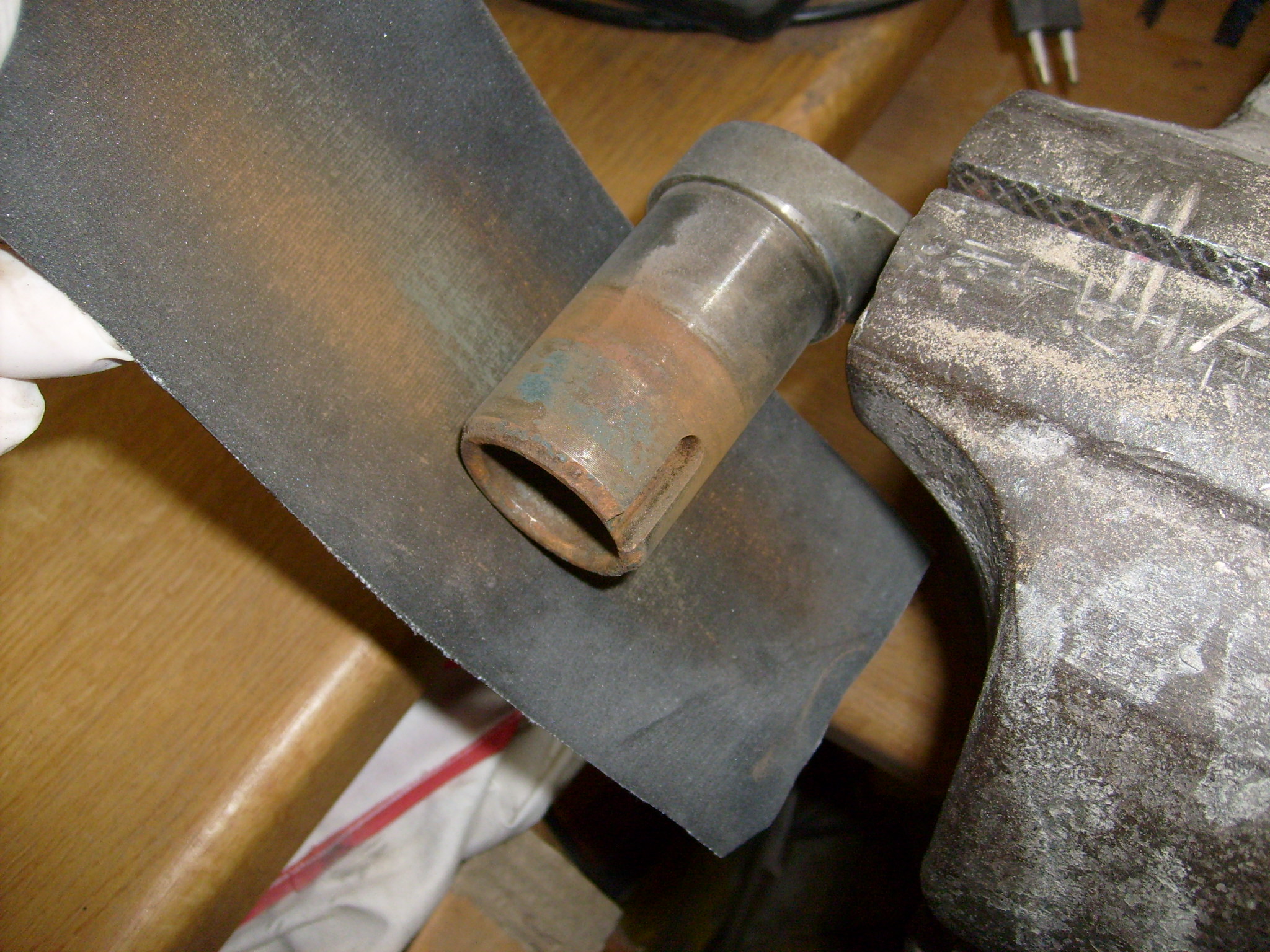 Man beginnt mit der Zapfwellenschaltung für das Heck. Der alte Simmering auf der Gehäuseaußenseite wurde vorher entfernt. Rostansatz an dem Schaltteil wird vor der Montage mit Schleifband entfernt...