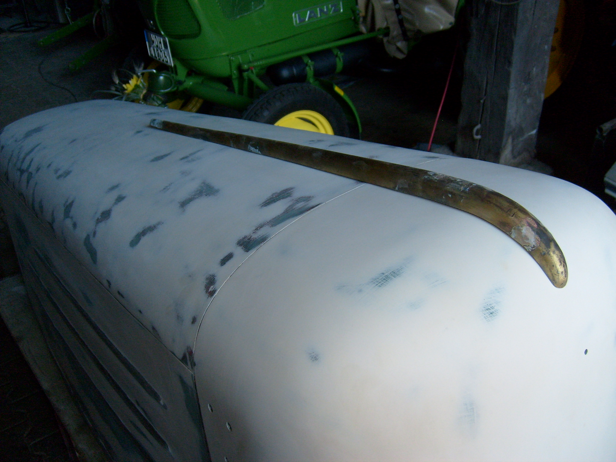 Und urplötzlich wurde das Wetter dermaßen gut und vor allem dauerhaft beständig und warm, dass wir uns mal wieder an unseren Angstgegener Nr. 1 trauten. Die Motorhaube! :wink: Sie stand dort nun seit über 90 Tagen fast fertig gespachtelt in der Scheune, aber die letzten Kleinigkeiten bis zur ersten Grundierung nach dem Spachteln und Schleifen dauerten dann noch mal einige Stunden. :oops: Die Trennfugen zwischen den einzelnen Blechen wurden mit einem Metallspachtel und umwickletem 600 er Schleifpapier in Form gebracht.