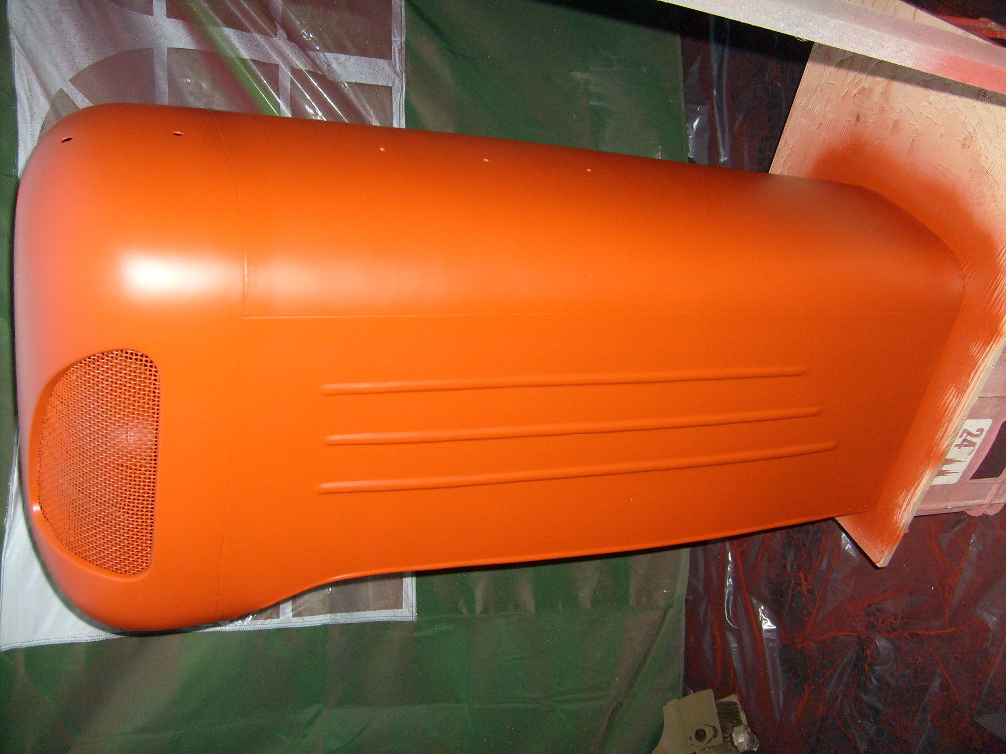 Danach wurde ganz normal aber wirklich satt grundiert mit Kunstharzgrundierung. Auch die Innenseite der Haube. Bilder davon wurden glatt vergessen. Na ja, die rot-braune Grundierung eben. Nach drei Tagen Trocknungszeit konnte die Grundierung mit einem grauen Schleifpad angeschliffen werden. Eventuelle grobkörnige Sachen die aus der Lackpistole geschleudert wurden, konnten mit 600 er Papier trocken geschliffen und somit entfernt werden. Nun wieder ein Durchgang mit dem Staubbindetuch. Wichtig ist dabei, dass man immer Einweghandschuhe anzieht. Sonst verreibt man den Handschweiß auf der gesamten Haube.
