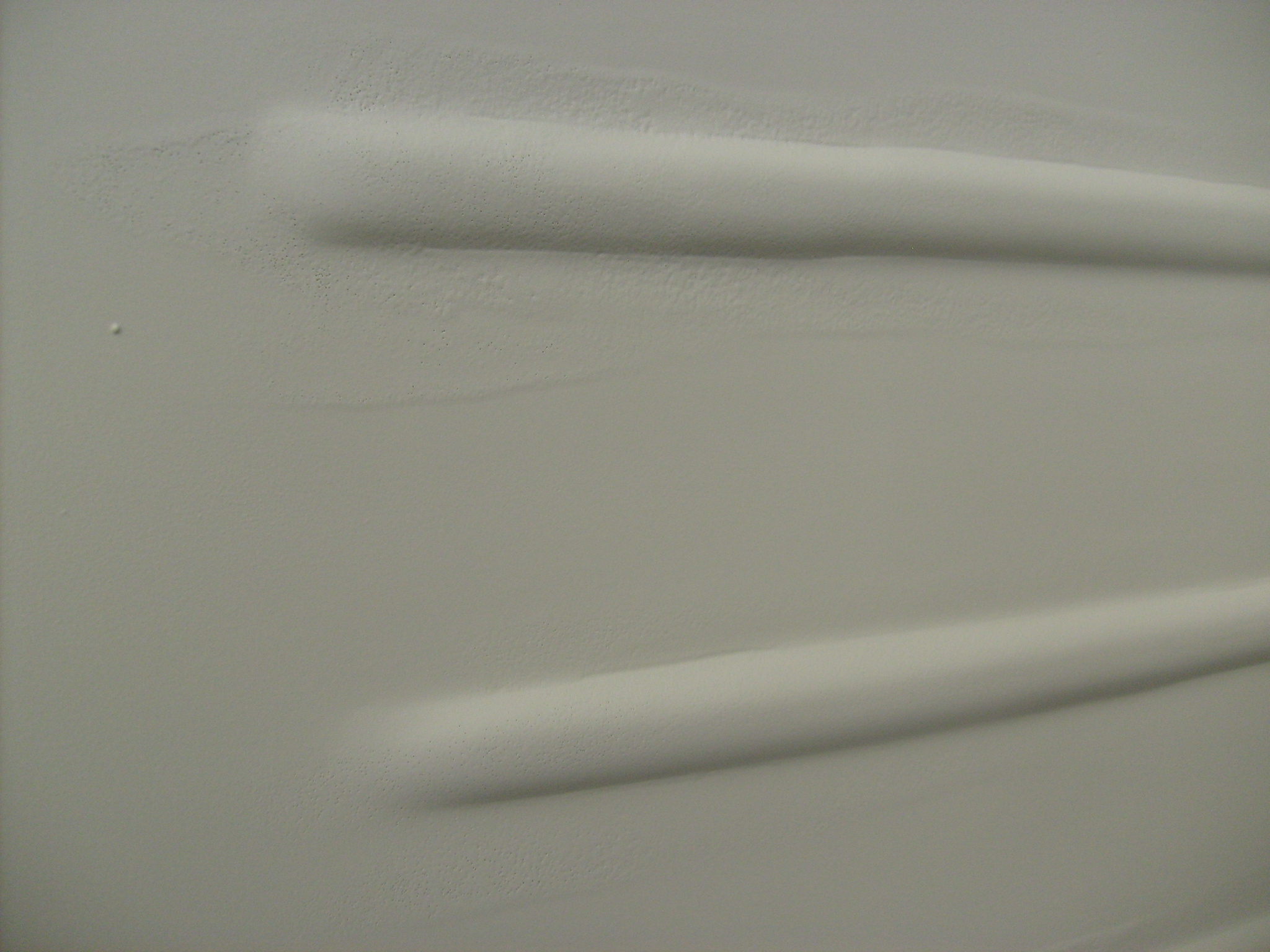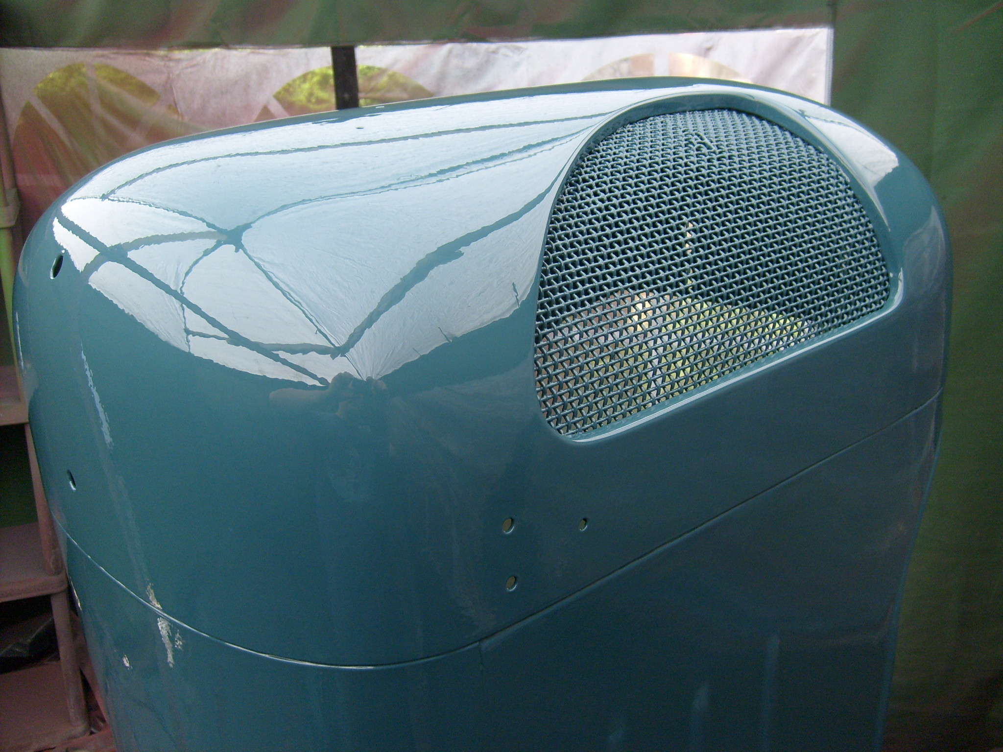 Abschließend wurde die Haube komplett mit klarem Wasser und Schwamm abgewaschen, um den Schleifschlamm zu entfernen. Mit Druckluft und einem Staubbindetuch wurde nachgeholfen. Die Verwendung von Silikonentferner ist nicht unbedingt ratsam, denn wie ich feststellen mußte, kann sich der Spritzspachtel dadurch anlösen, wenn man unvorsichtig ist. Zumindest der Spritzspachtel aus der Dose bei vermutlich zu sattem Auftrag und nicht vollständiger Trocknungszeit.